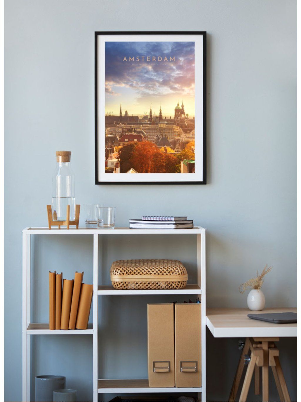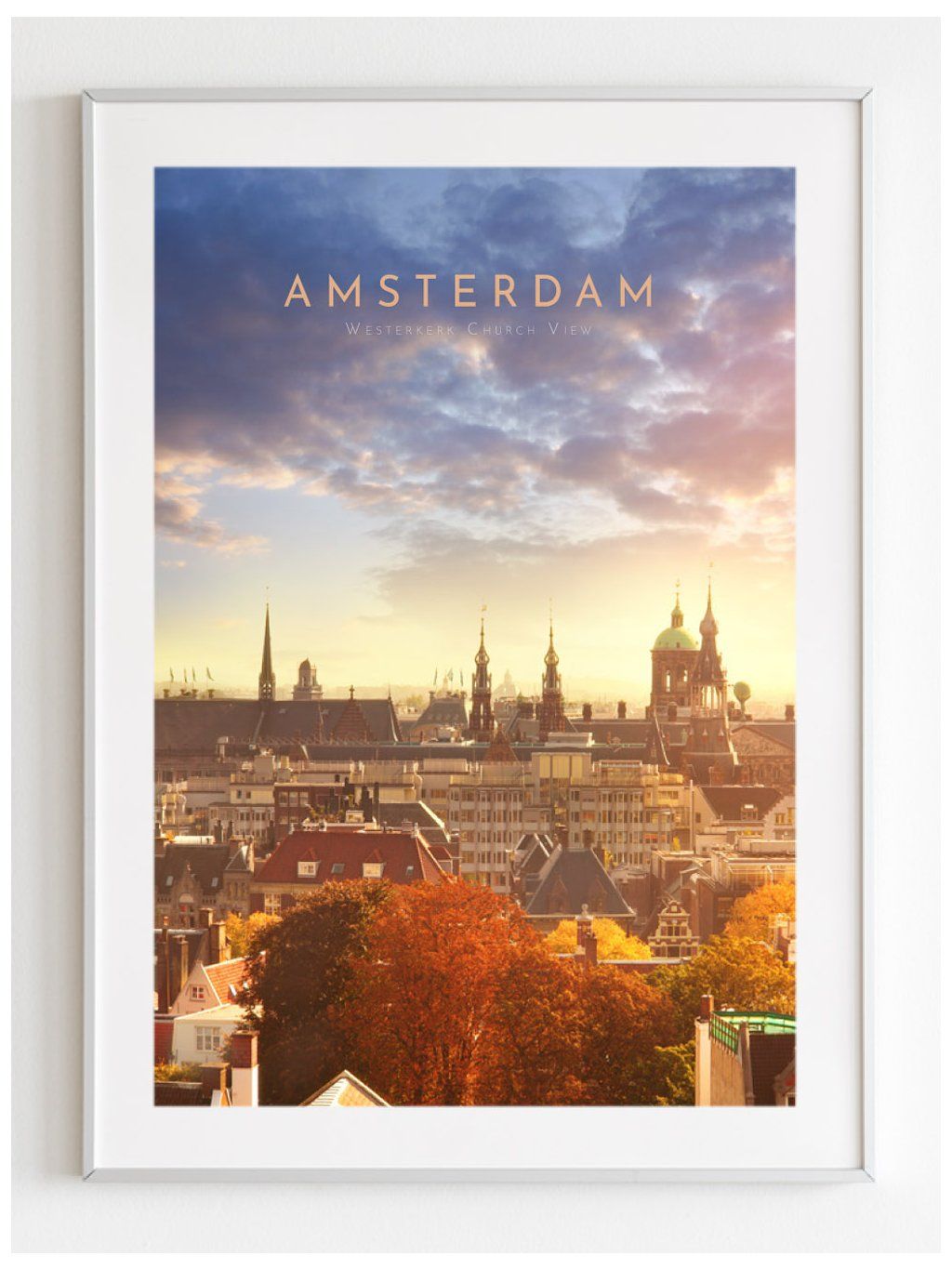Plakát hlavní město Holandska Amsterdam, čtvrť Westerkerk v záři zapadajícího slunce s bílým okrajem.