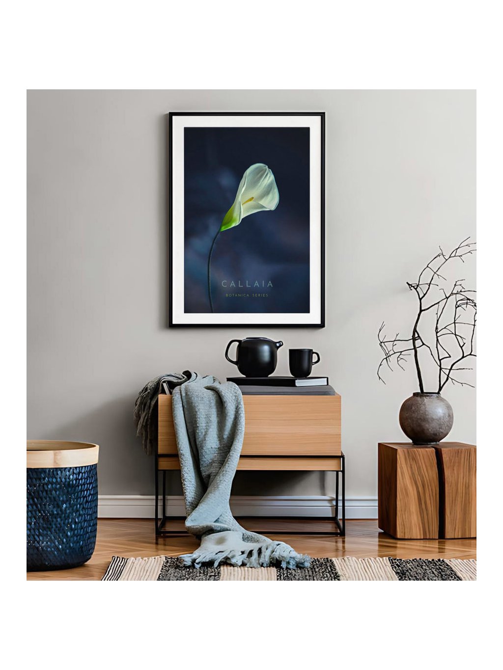 Plakát romantický bílý květ Callaia v detailu s bílým okrajem.