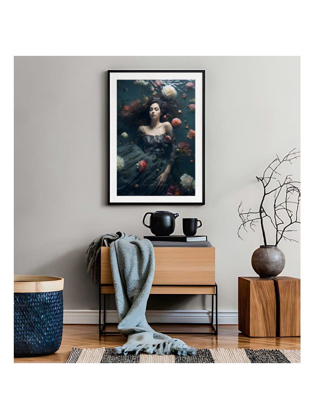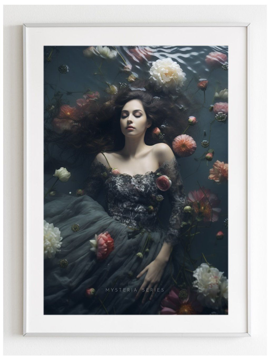 Plakát Snící mladá dívka s květinami na hladině, s bílým okrajem.