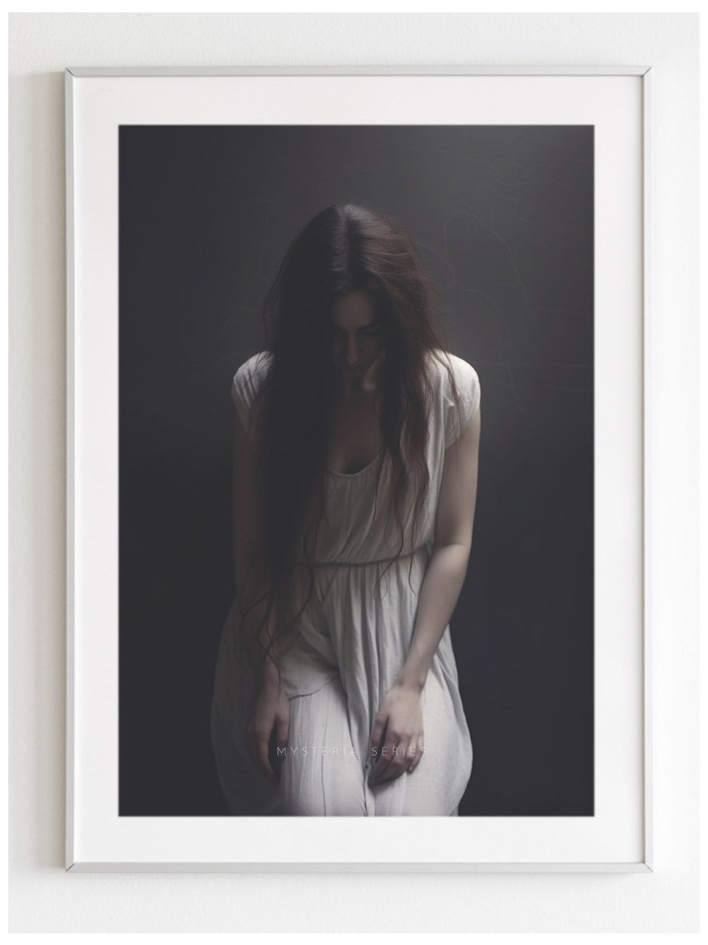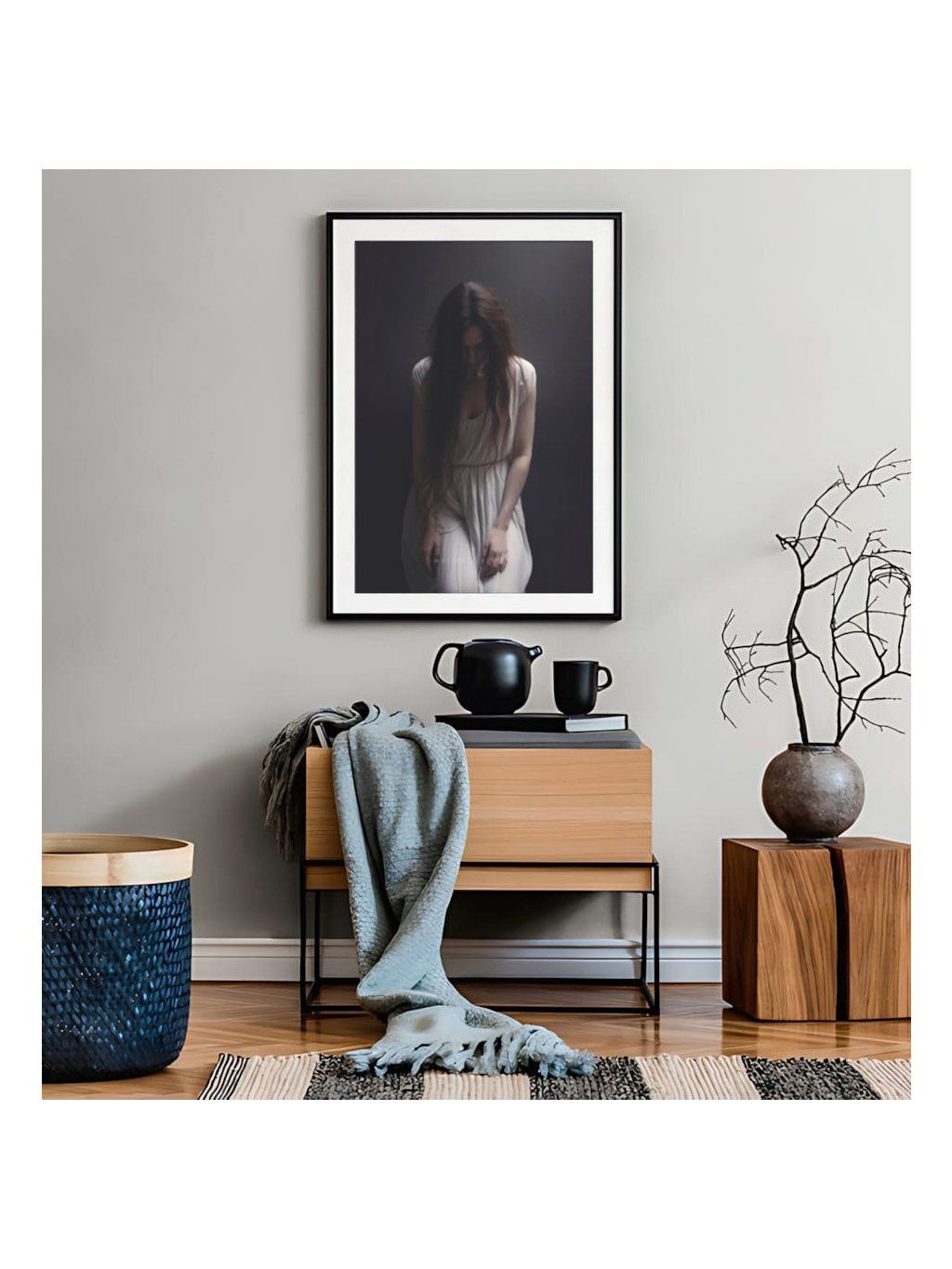 Plakát Mladá dívka v bílých šatech s rozpuštěnými vlasy, s bílým okrajem.