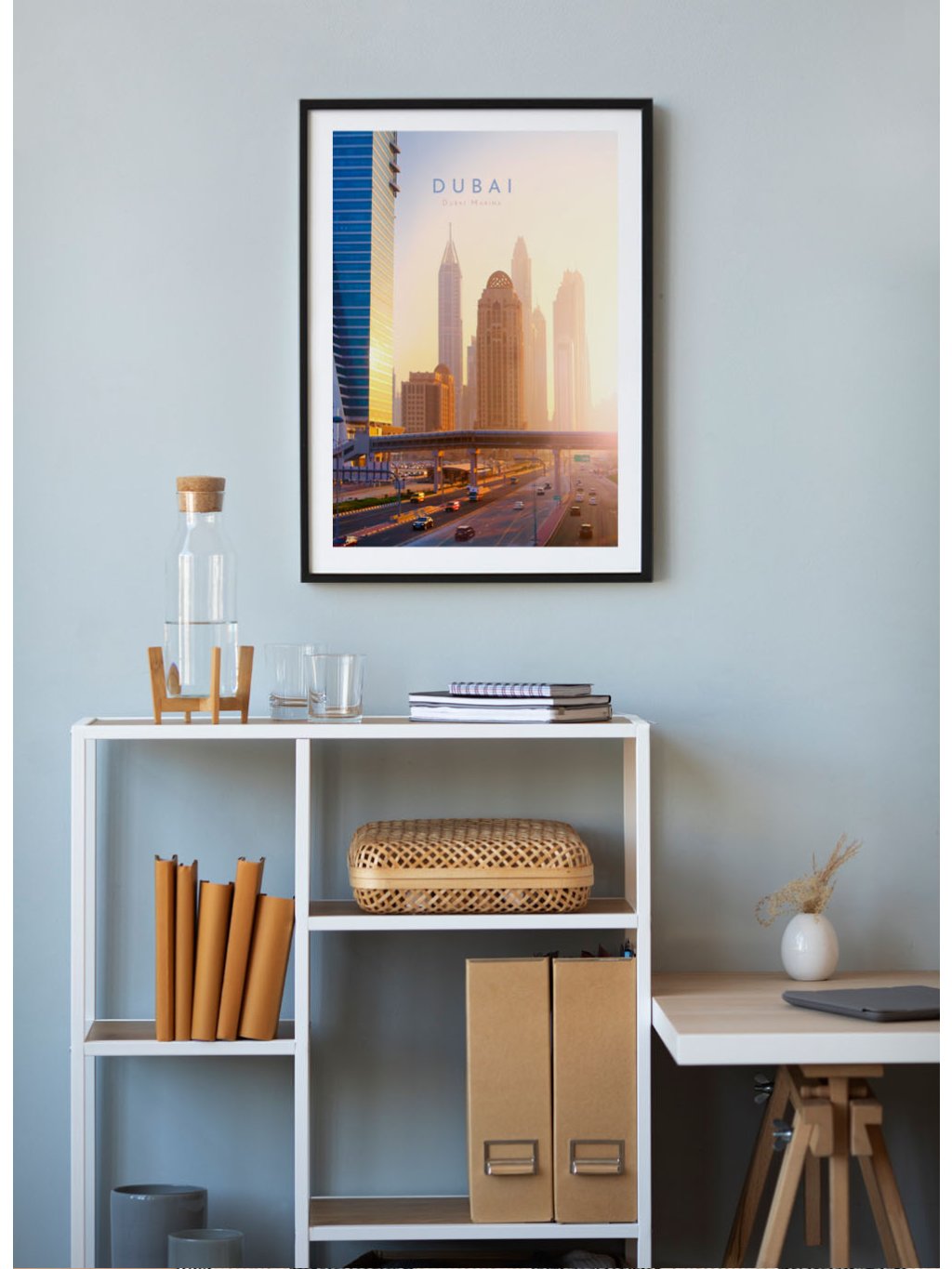 Plakát Dubaj Marina v záři zapadajícího slunce s bílým okrajem.