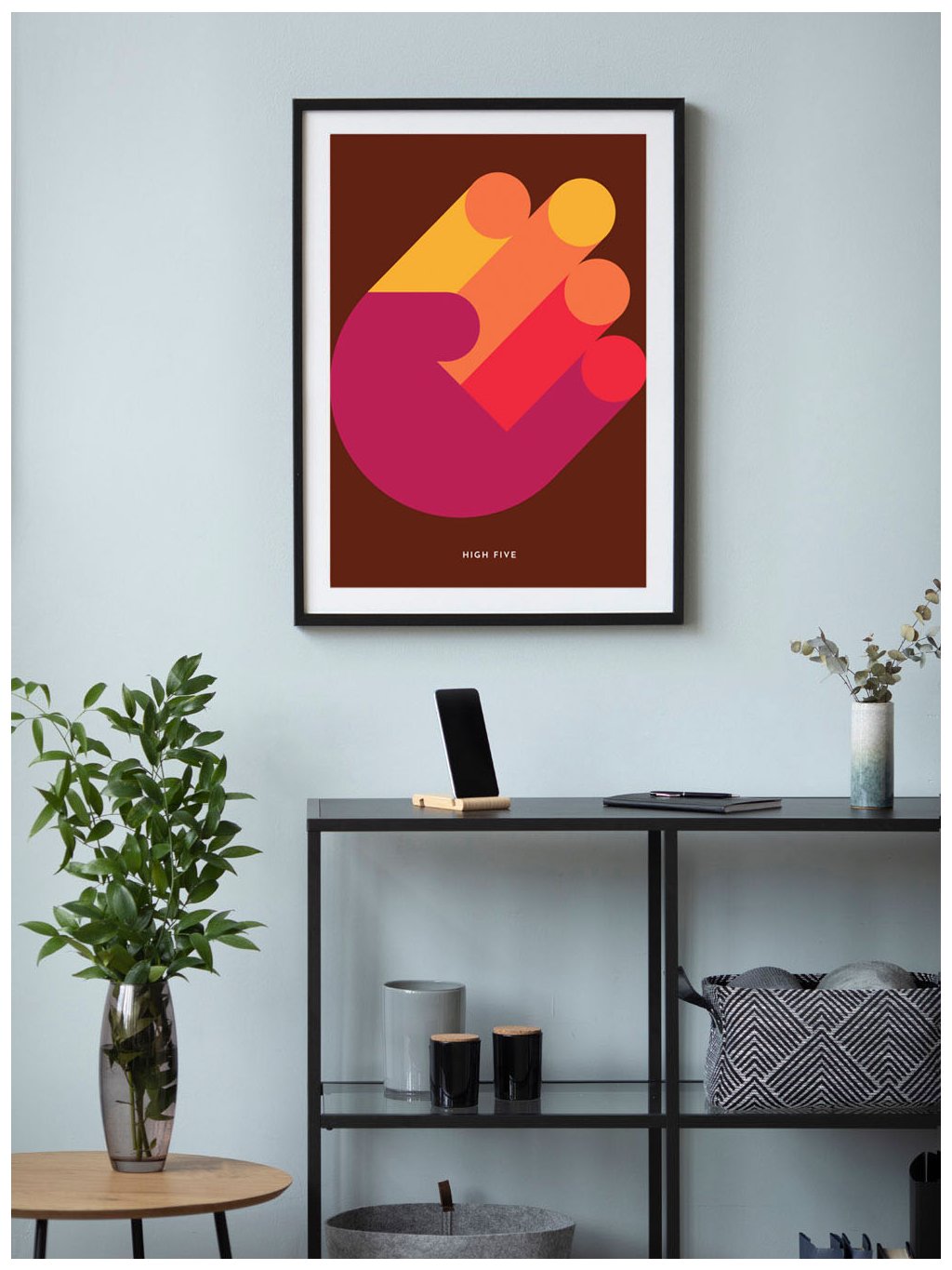 Grafický plakát High Five s bílým okrajem s podpisem autora.