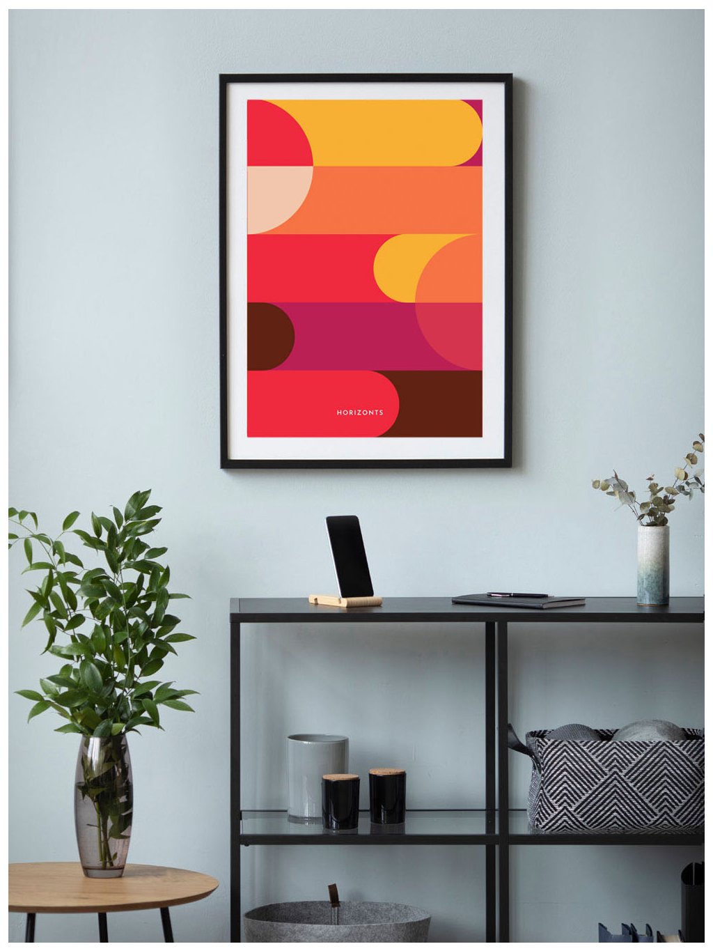 Plakát "Horizonts" - Originální autorské grafické plakáty navržené s důrazem na jedinečnost a estetiku. Každý je součástí jednotné série, která propojuje vizuální prvky do harmonického celku, zároveň barevně ladí v rámci celé série. Tyto plakáty jsou ideální pro moderní interiéry, kde mohou sloužit jako stylový a originální doplněk. Série reflektuje pečlivou práci autora a jeho snahu o propojení umění s emocemi, přičemž každé dílo vypráví svůj vlastní příběh prostřednictvím barev, tvarů a kompozice.