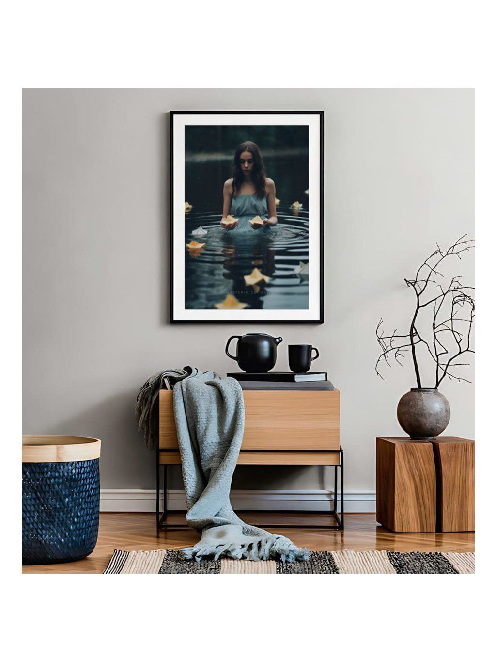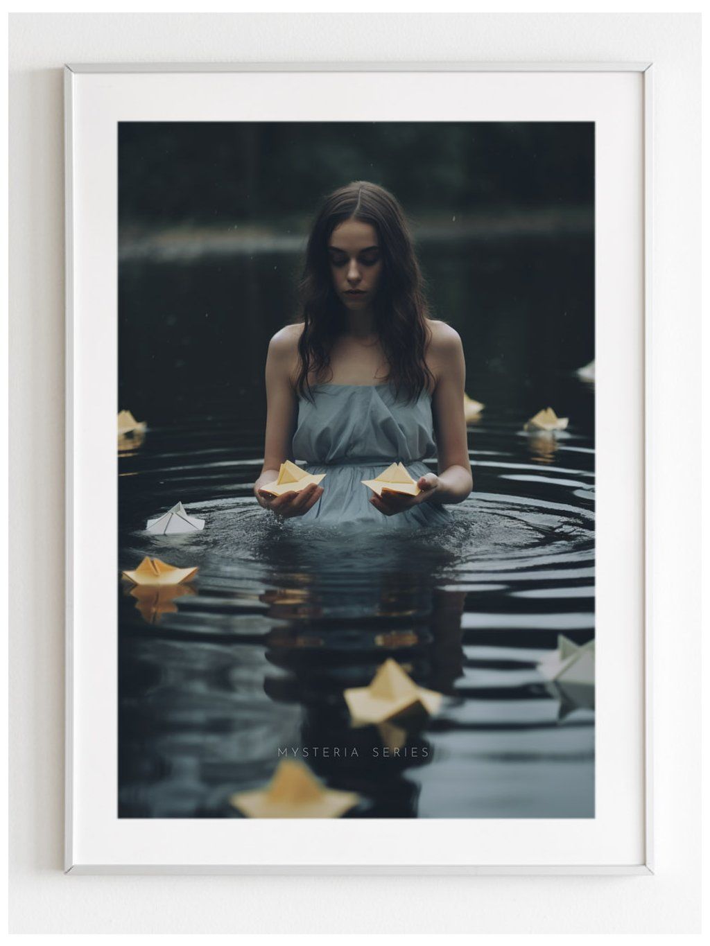 Plakát Mladá dívka hrající si s papírovými loďkami na hladině, s bílým okrajem.