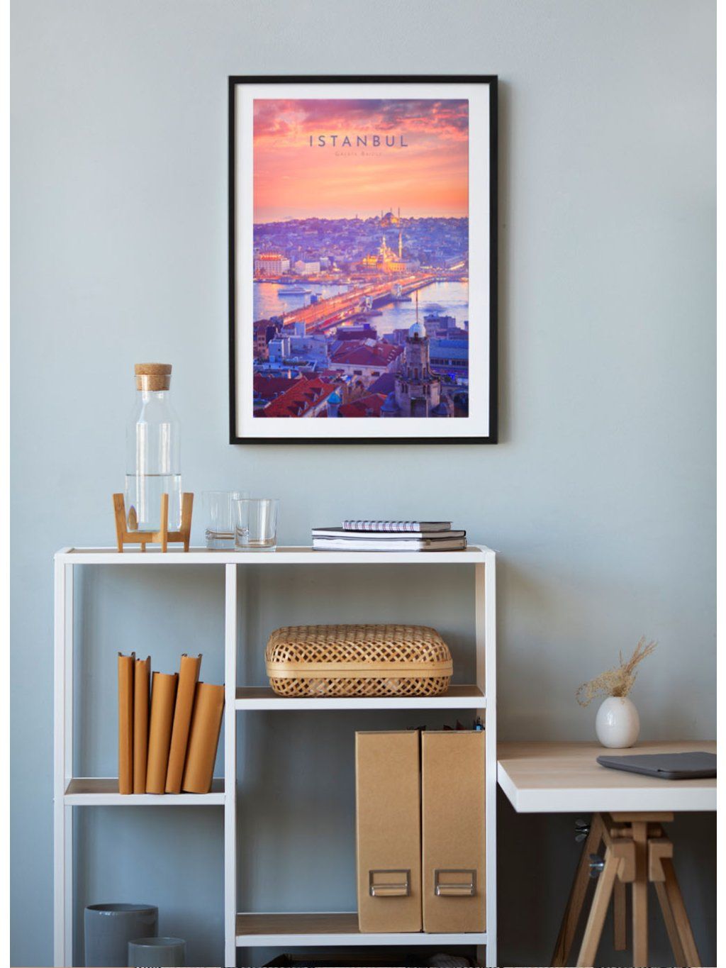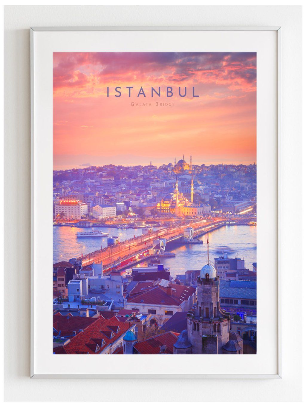 Plakát Istanbul Galata Bridge při západu slunce s bílým okrajem.