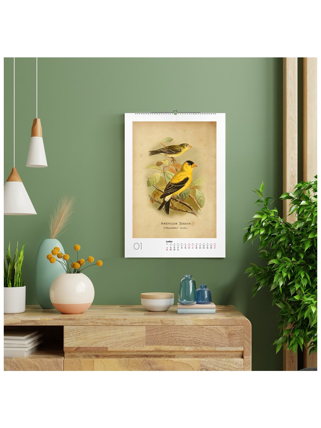 Kalendář Antiqua pro rok 2026 s jedinečnými retro ilustracemi přírodních motivů: ptáci, brouci, lastury, motýli....