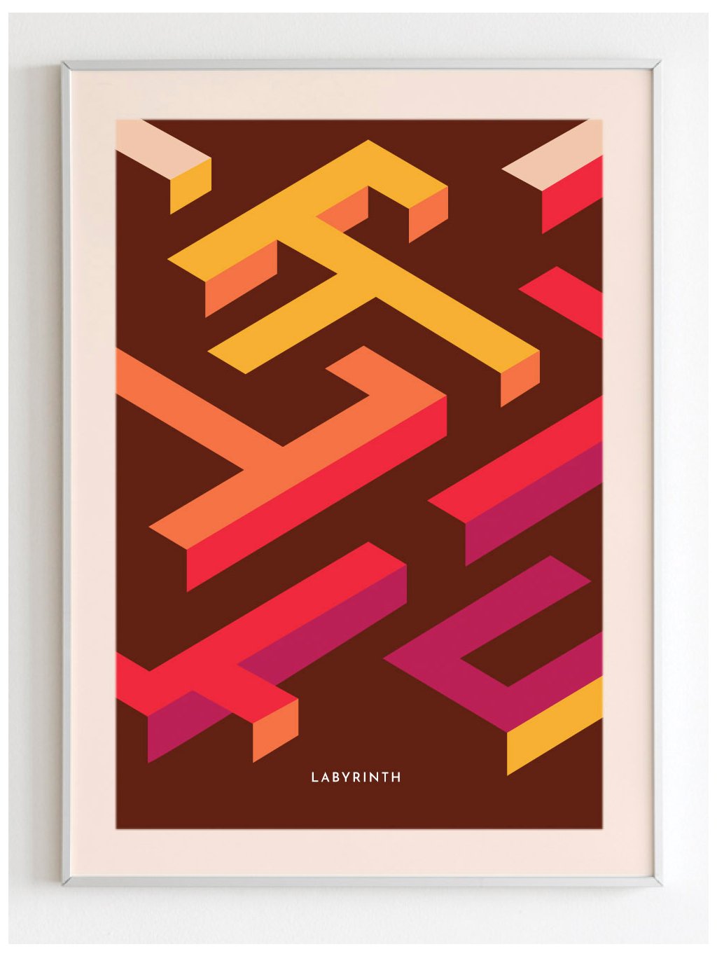 Grafický plakát Labyrinth s bílým okrajem s podpisem autora.