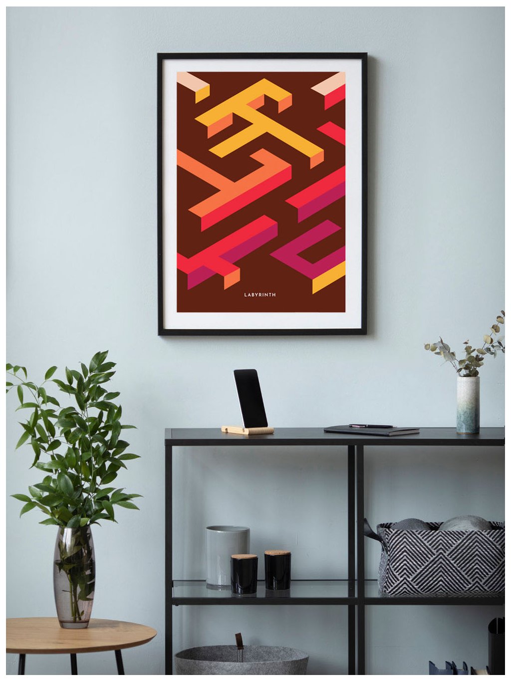 Plakát "Labyrinth" - originální autorské grafické plakáty navržené s důrazem na jedinečnost a estetiku. Každý je součástí jednotné série, která propojuje vizuální prvky do harmonického celku, zároveň barevně ladí v rámci celé série. Tyto plakáty jsou ideální pro moderní interiéry, kde mohou sloužit jako stylový a originální doplněk. Série reflektuje pečlivou práci autora a jeho snahu o propojení umění s emocemi, přičemž každé dílo vypráví svůj vlastní příběh prostřednictvím barev, tvarů a kompozice.