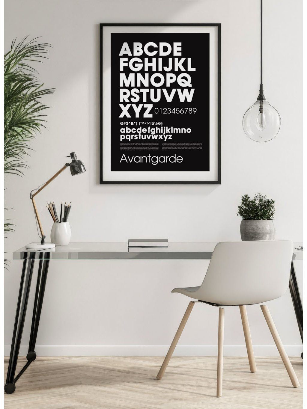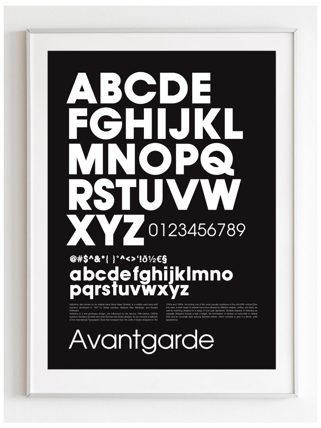 Plakát s přehlednou ukázkou písma Avantgarde na tmavém pozadí s bílým okrajem.