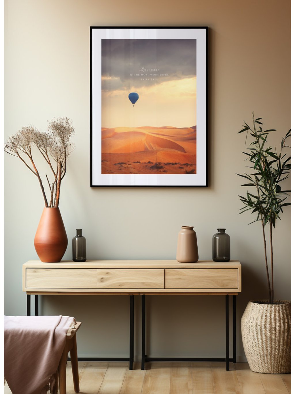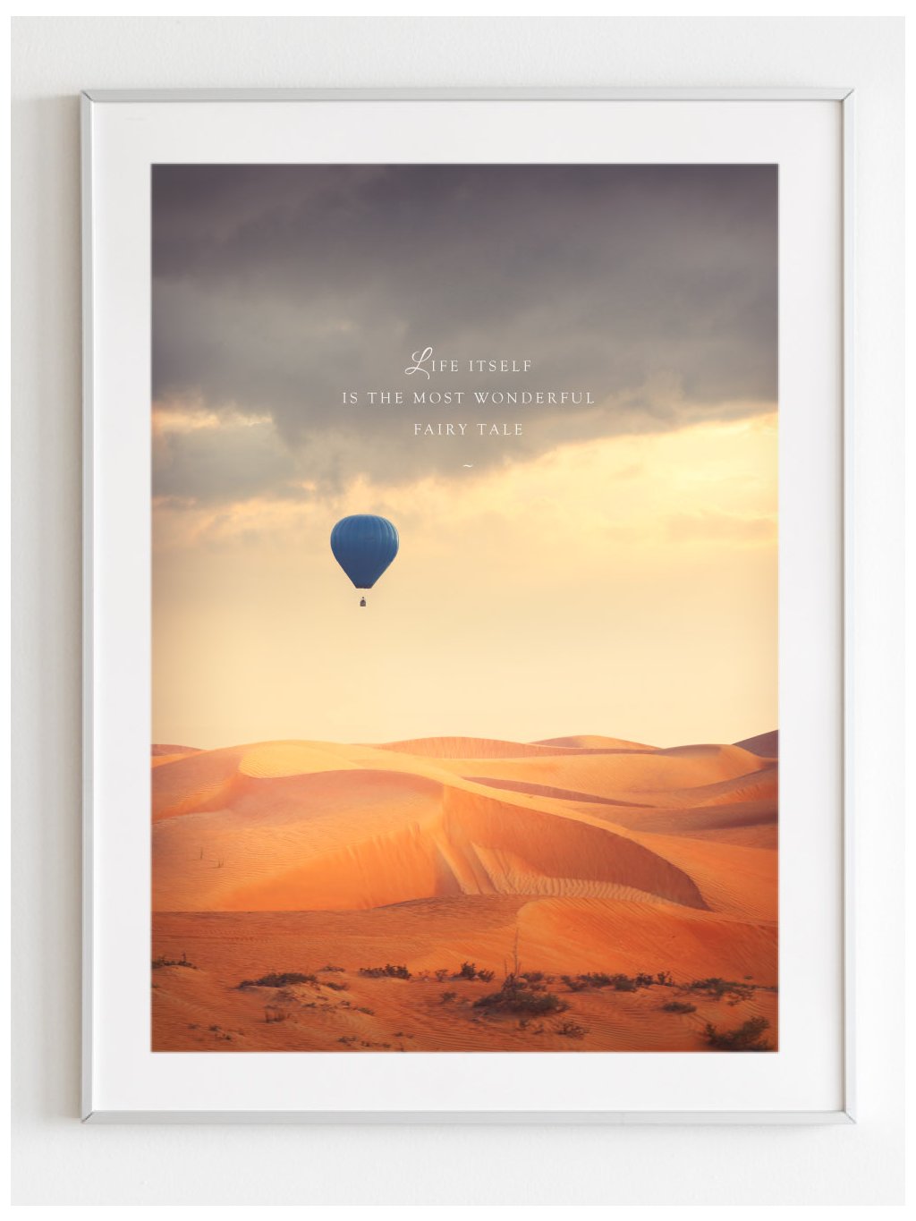 Motivační plakát balón letící nad pouští s citátem "Life itself is the most wonderful fairy tale" - "Život je nejůžasnější pohádkový příběh..." s bílým okrajem.