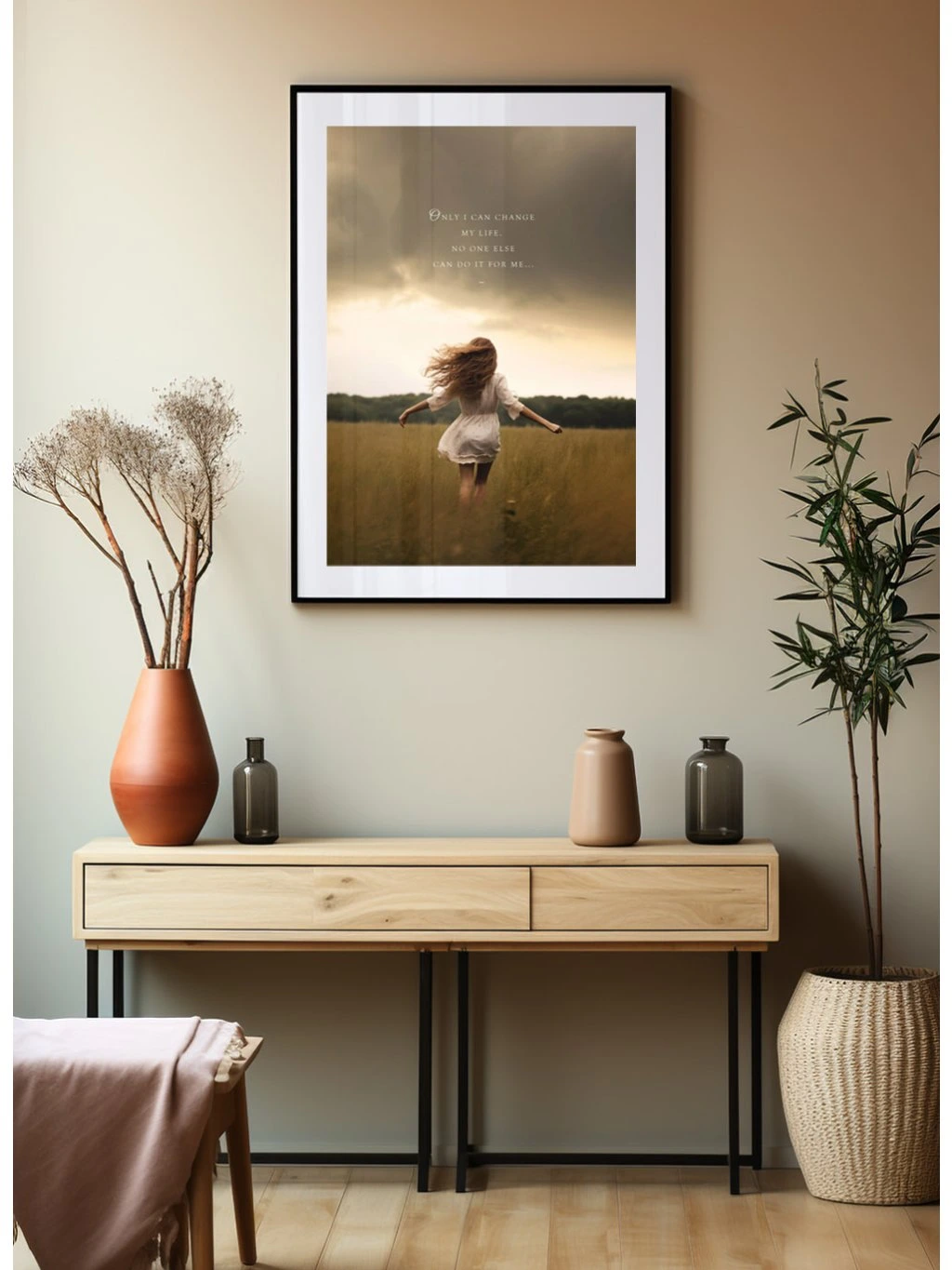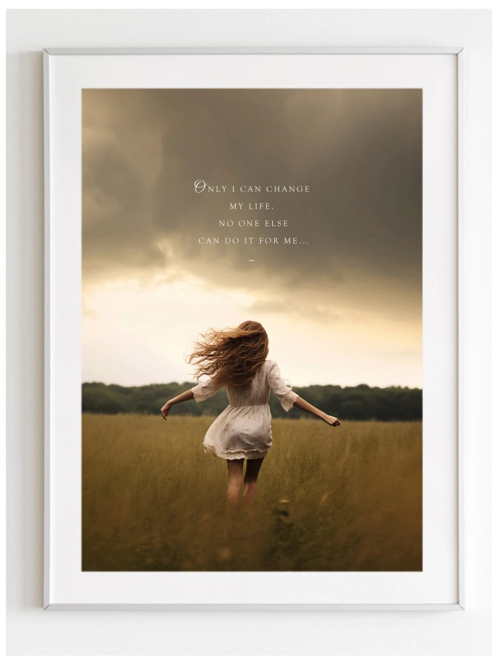 Motivační plakát běžící dívky na louce s citátem "Only I can change my life, no one else can do it for me..." s bílým okrajem.