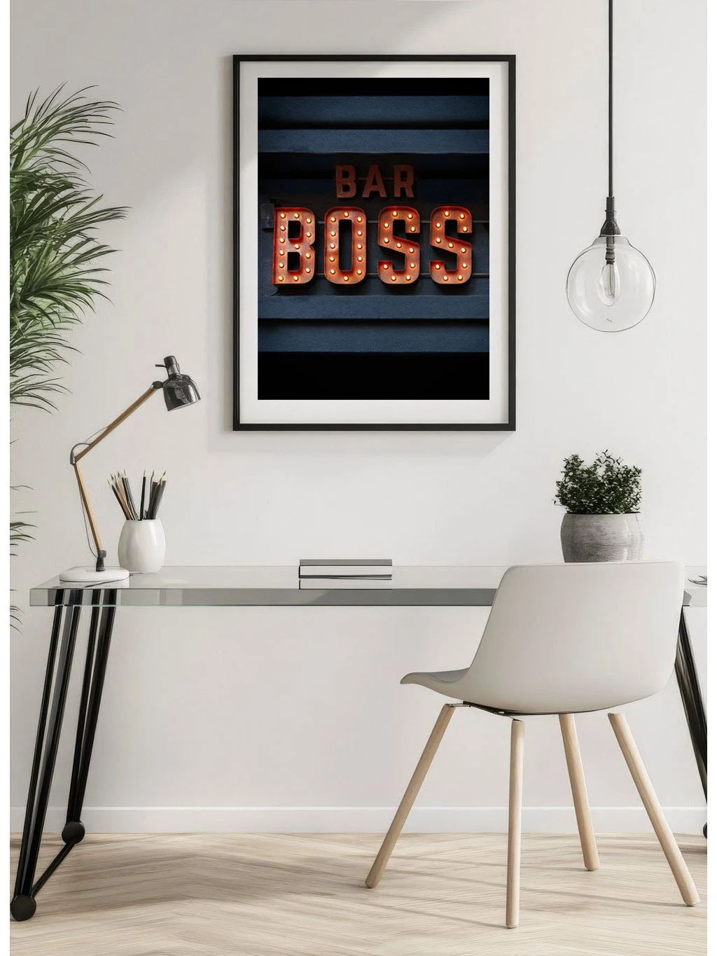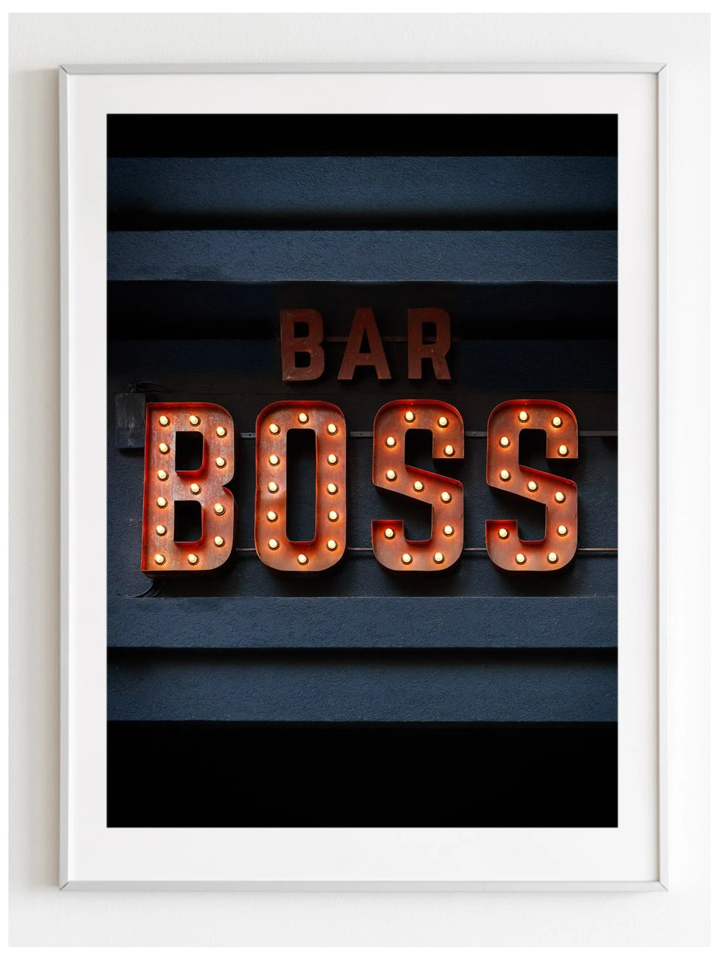 Plakát s nápisem z plastických písmen Bar Boss na tmavém pozadí. Nástěnný plakát ve fotokvalitě standardně ve formátech 21x30, 30x40, 40x50 a 50x70 cm. Nestandardní formát lze vyrobit na požádání.