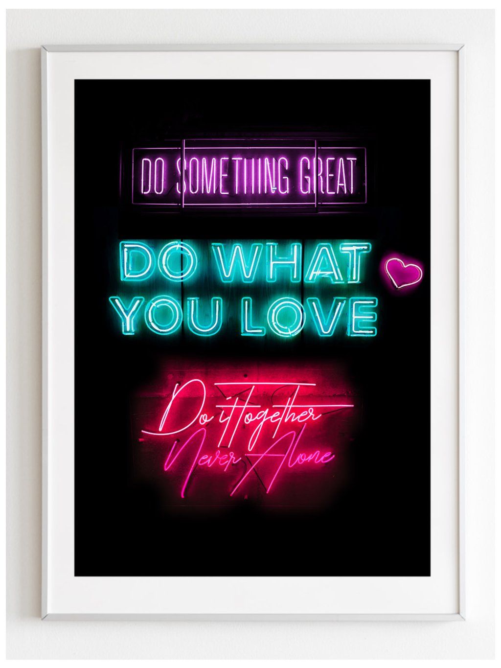 Plakát s neonovým nápisem "Do something great, do what you love, do it together, never alone" na tmavém pozadí.