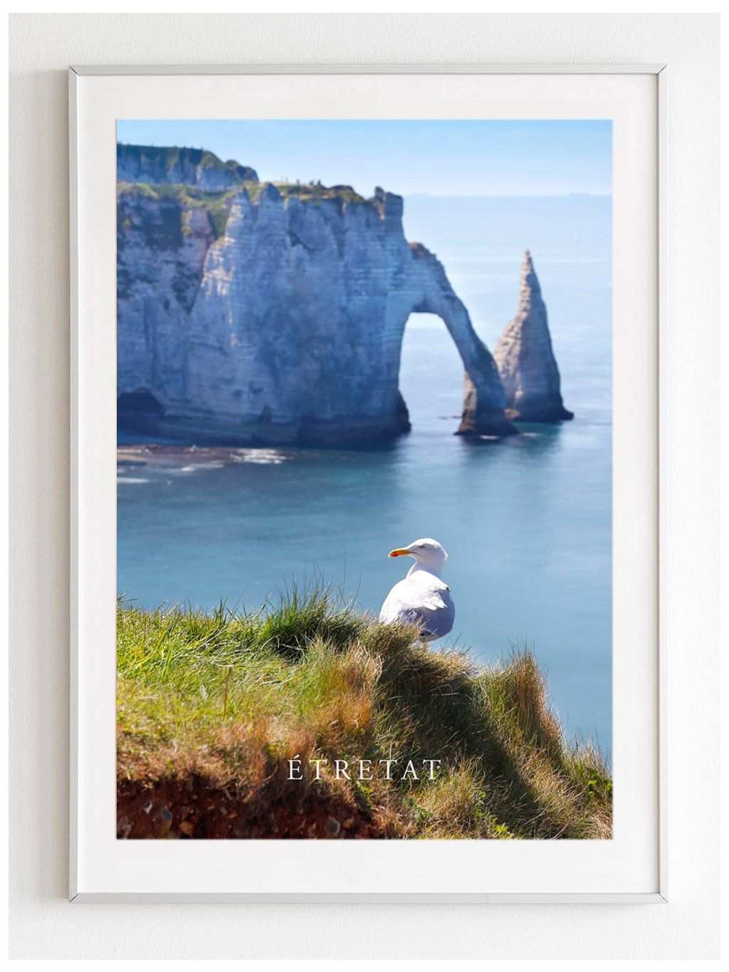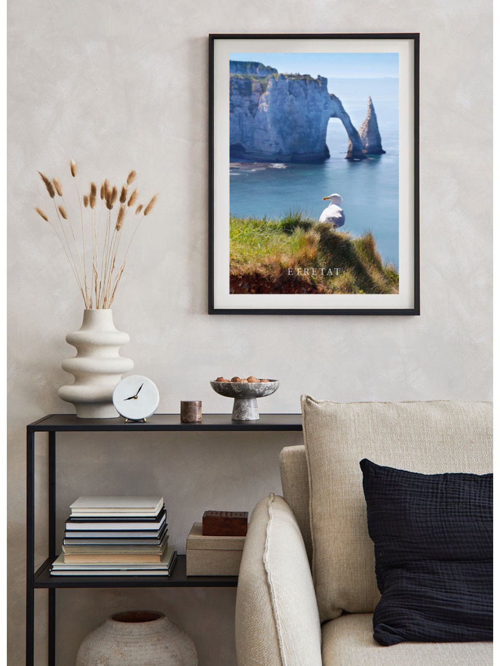 Plakát ikonické skály na francouzském pobřeží v Normandii u města Étretat.