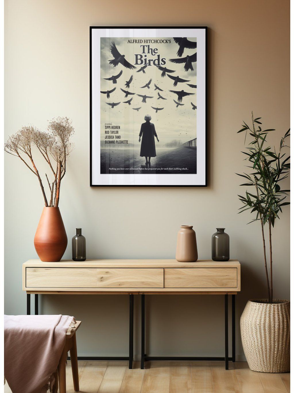 Filmový plakát mistrovského hororového díla Alfreda Hitchcocka Ptáci, s bílým okrajem.