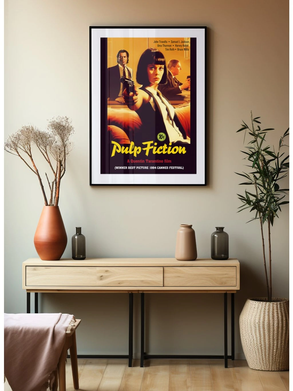 Kultovní film devadesátých let Quentina Tarantina Pulp Fiction, s bílým okrajem.