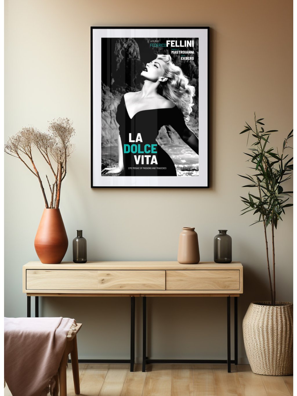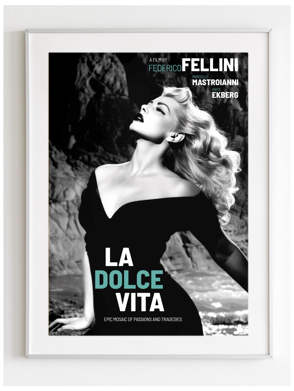 Lesk a bída života římské smetánky očima oscarového režiséra Federica Felliniho na plakátu filového dramatu Sladký život, s bílým okrajem.