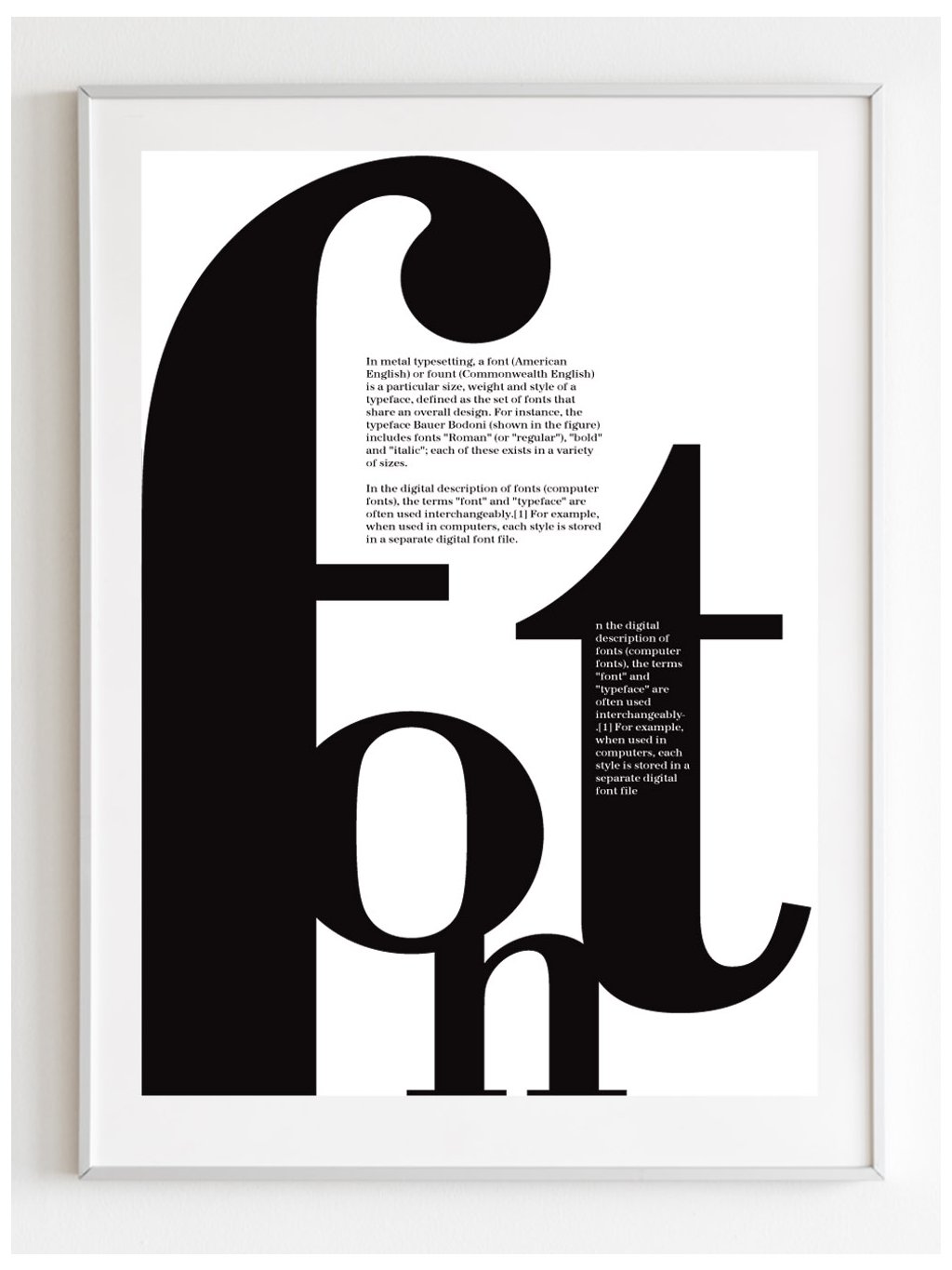 Grafický plakát font s písmem Bodoni Antiqua na tmavém pozadí s anglickým popiskem. Nástěnný plakát ve fotokvalitě standardně ve formátech 21x30, 30x40, 40x50 a 50x70 cm. Nestandardní formát lze vyrobit na požádání.