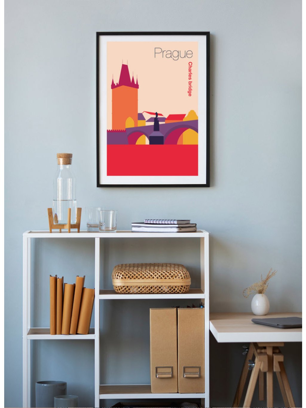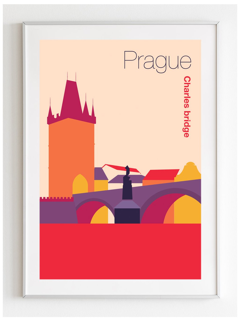 Plakát autorská grafika Praha Karlův most s bílým okrajem.
