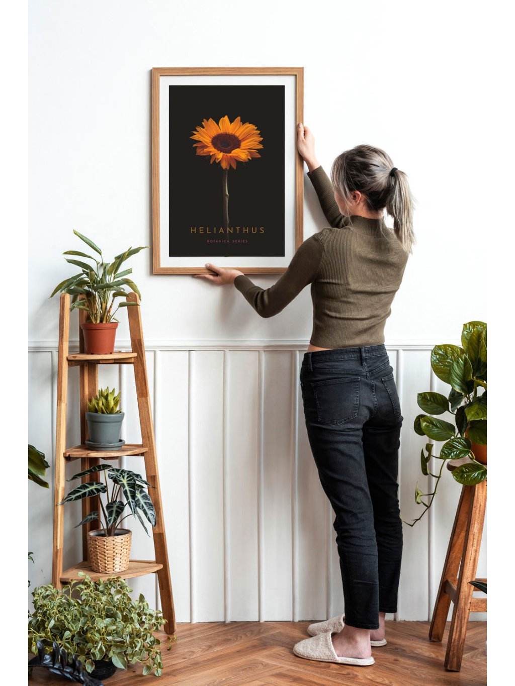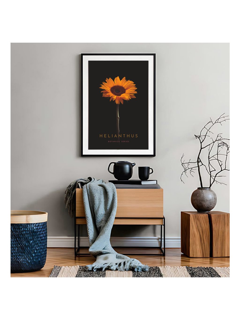 Plakát květ slunečnice na tmavém pozadí s bílým okrajem.