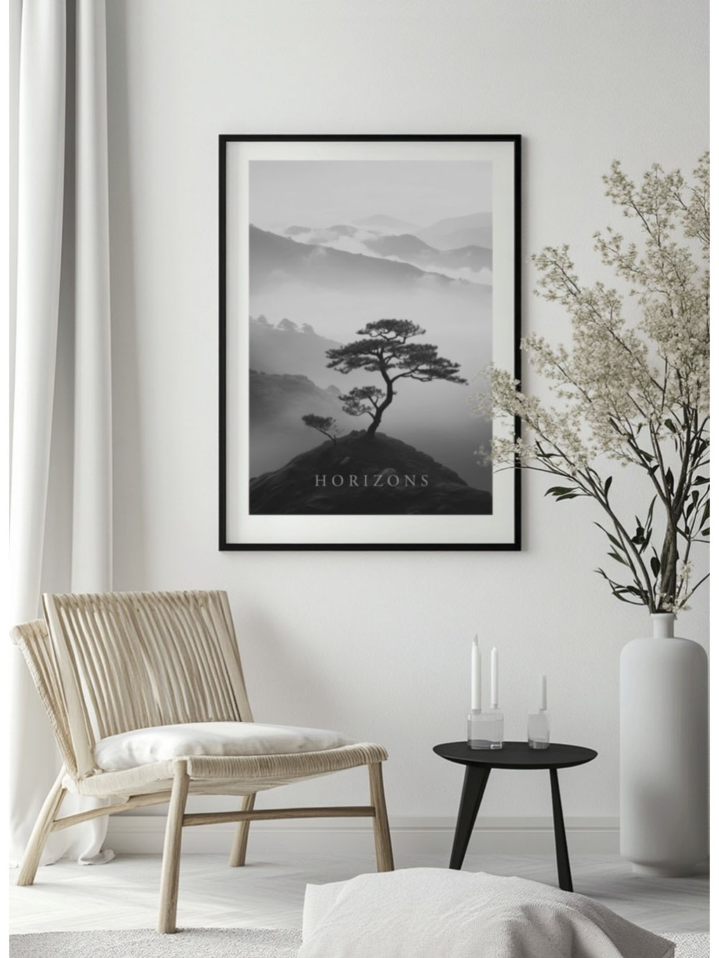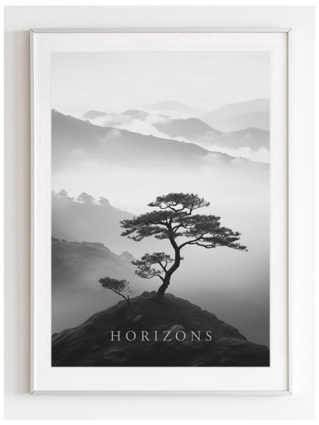 Černobílý plakát "Horizons" silueta borovice na vrcholu hor s bílým okrajem.