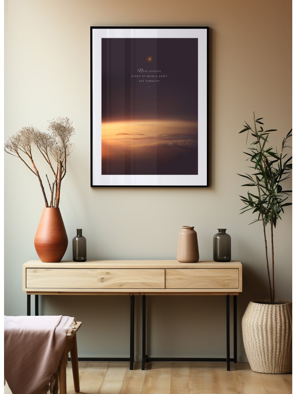 Motivační plakát vesmíru s citátem "Není hvězdy, která by mohla zářit bez temnoty" s bílým okrajem.