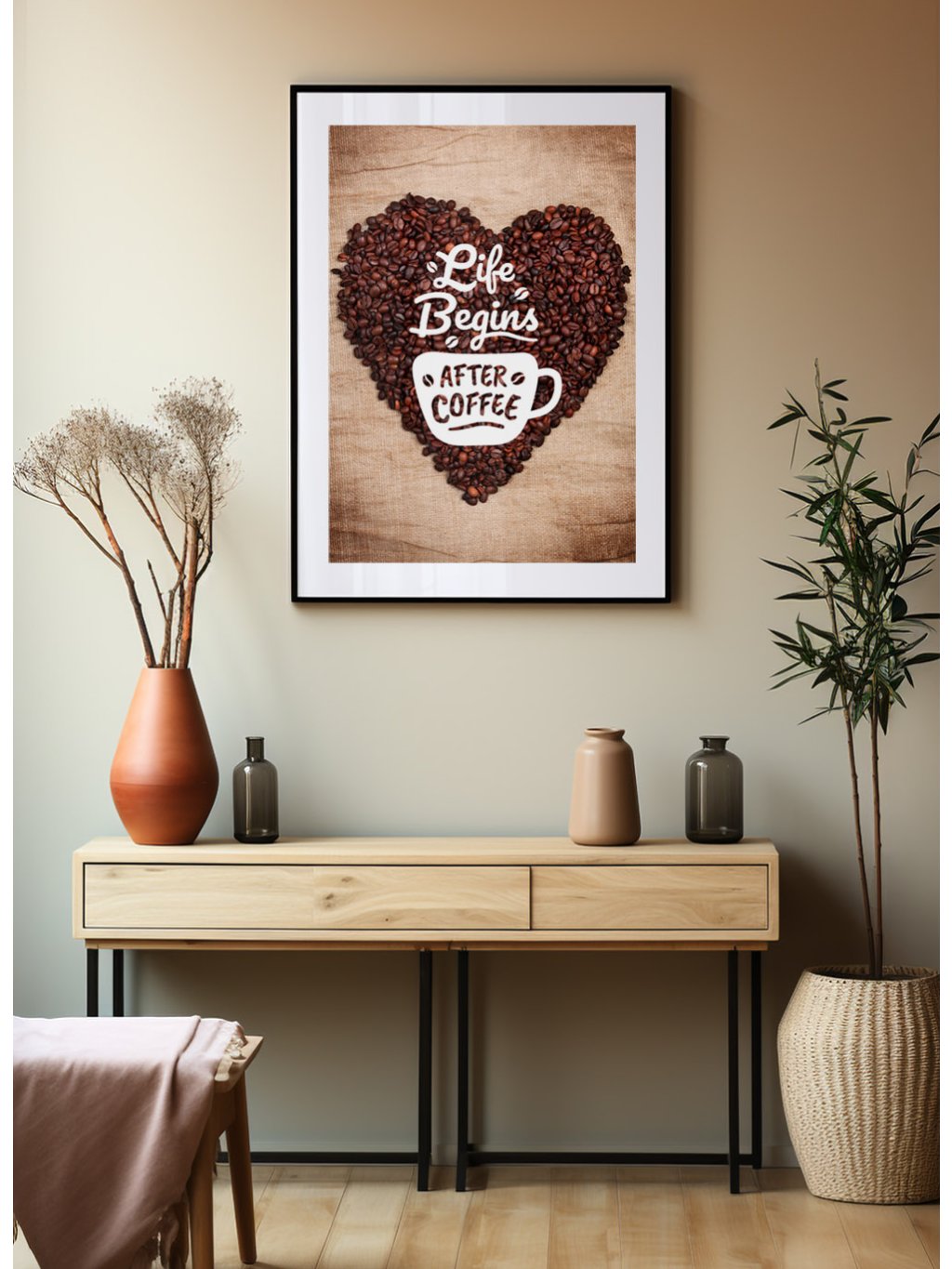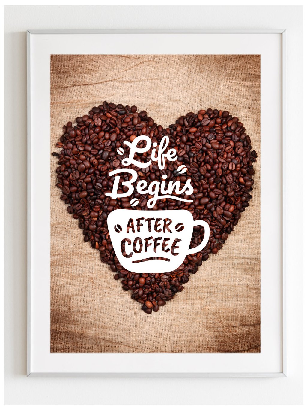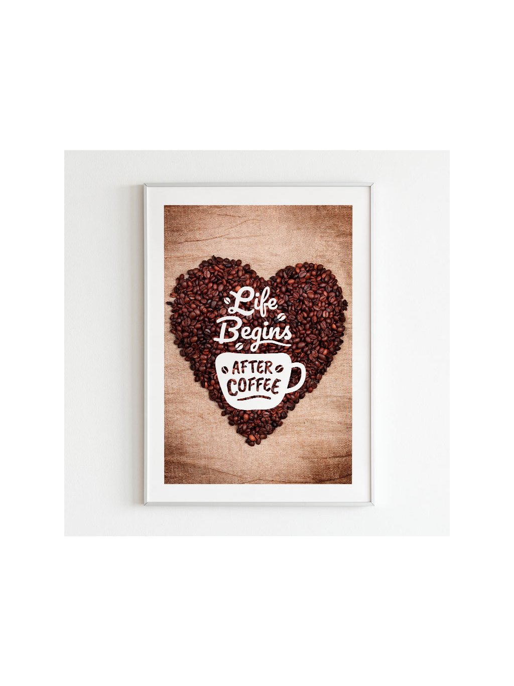 Motivační plakát pro milovníky dobré kávy s citátem v angličtině "Life begins after coffee" s bílým okrajem.
