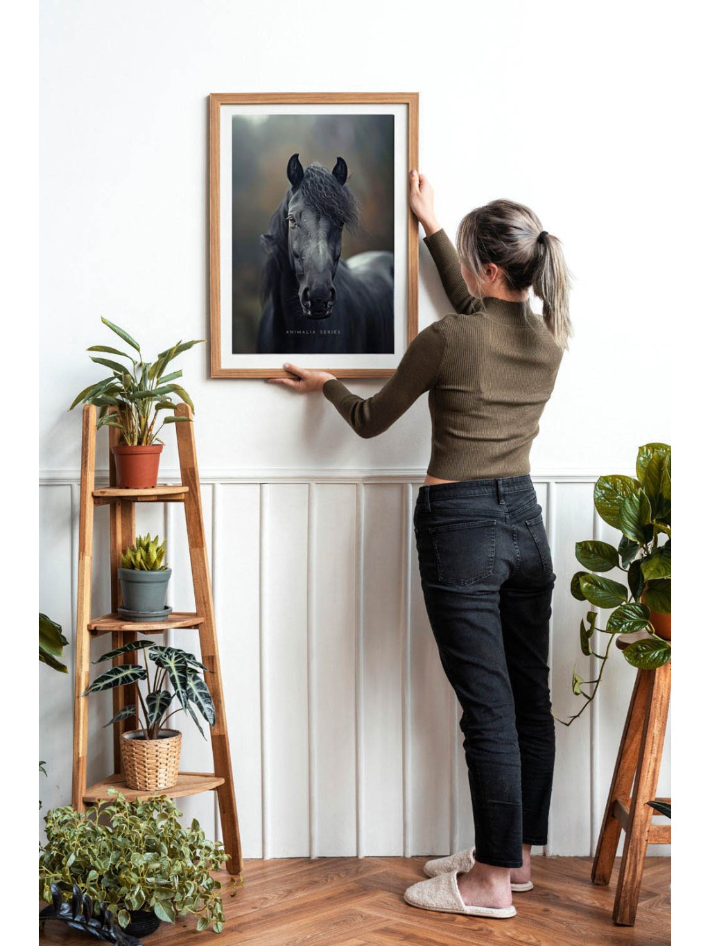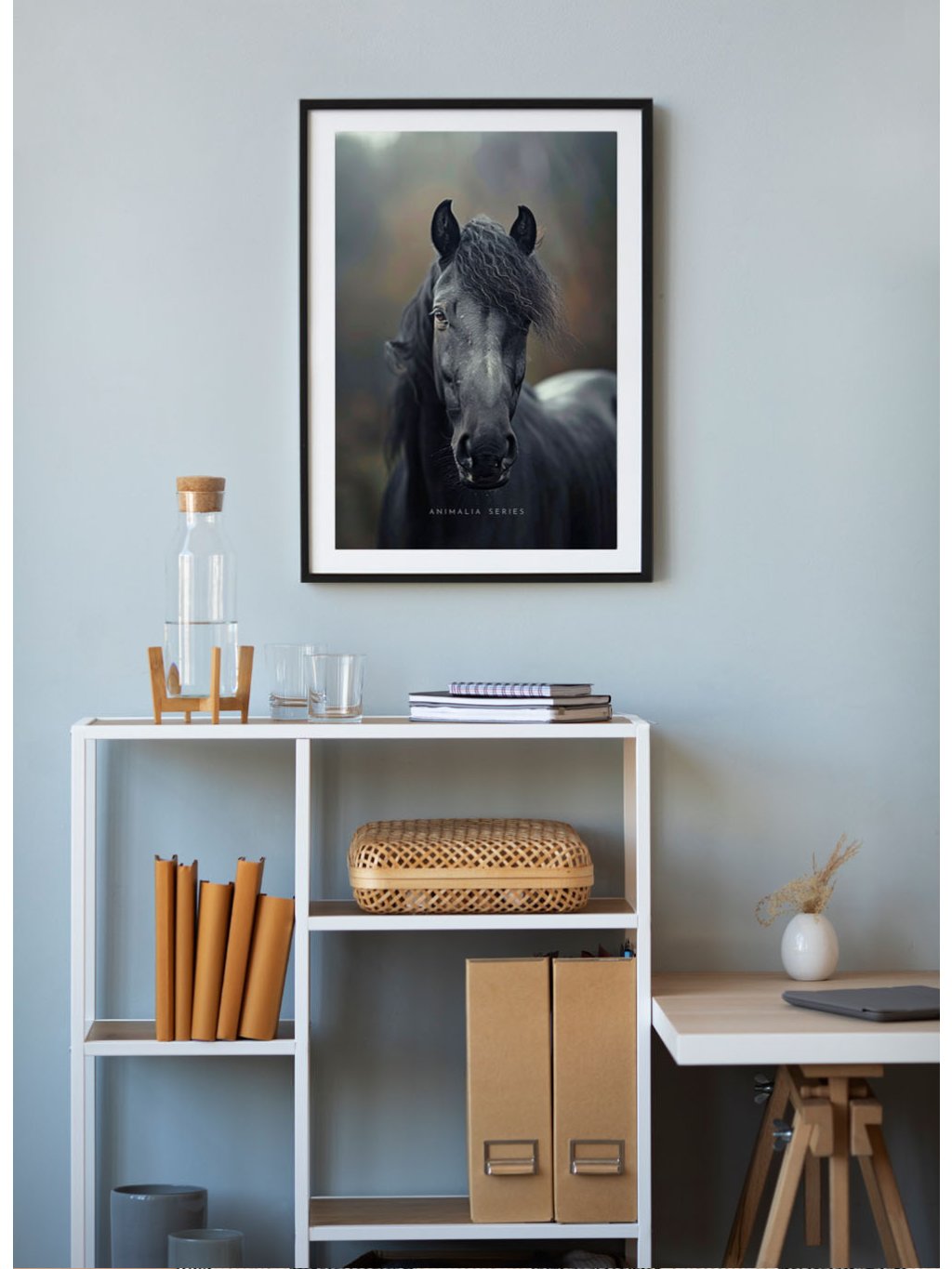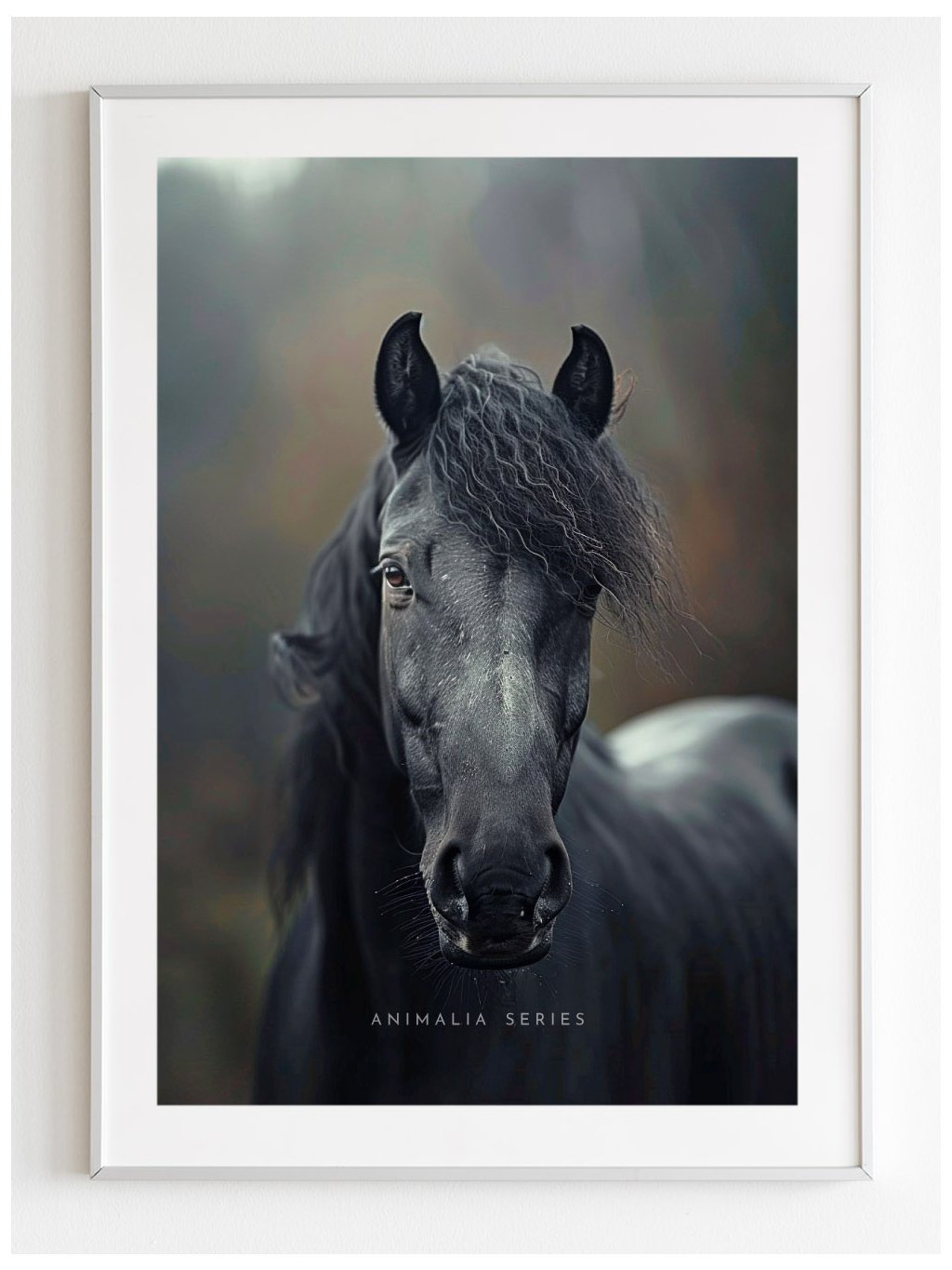 Umělecký portrét černého vraníka s osobitým charakterem a atmosférou, nejen pro milovníky koní a zvířat. Nástěnný plakát ve fotokvalitě standardně ve formátech 21x30, 30x40, 40x50 a 50x70 cm. Nestandardní formát lze vyrobit na požádání. Barevnost na obrazovce je orientační a záleží na nastavení monitoru, v reálném tisku se může mírně lišit.