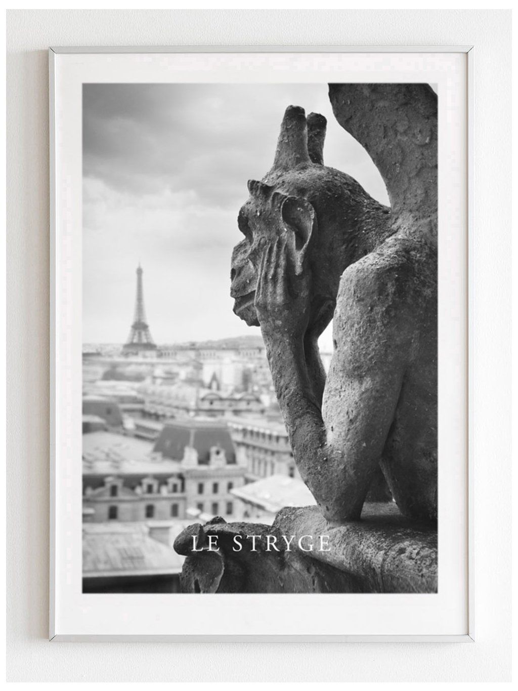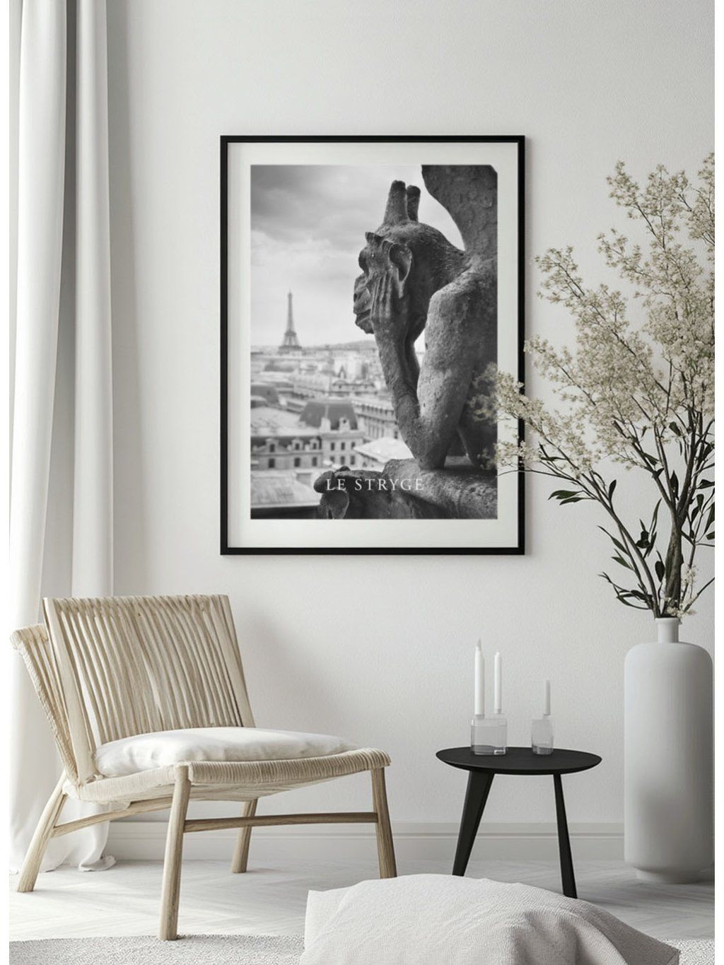 Černobílý plakát "Le Stryge" socha na katedrále Notre Dame v Paříži s bílým okrajem.