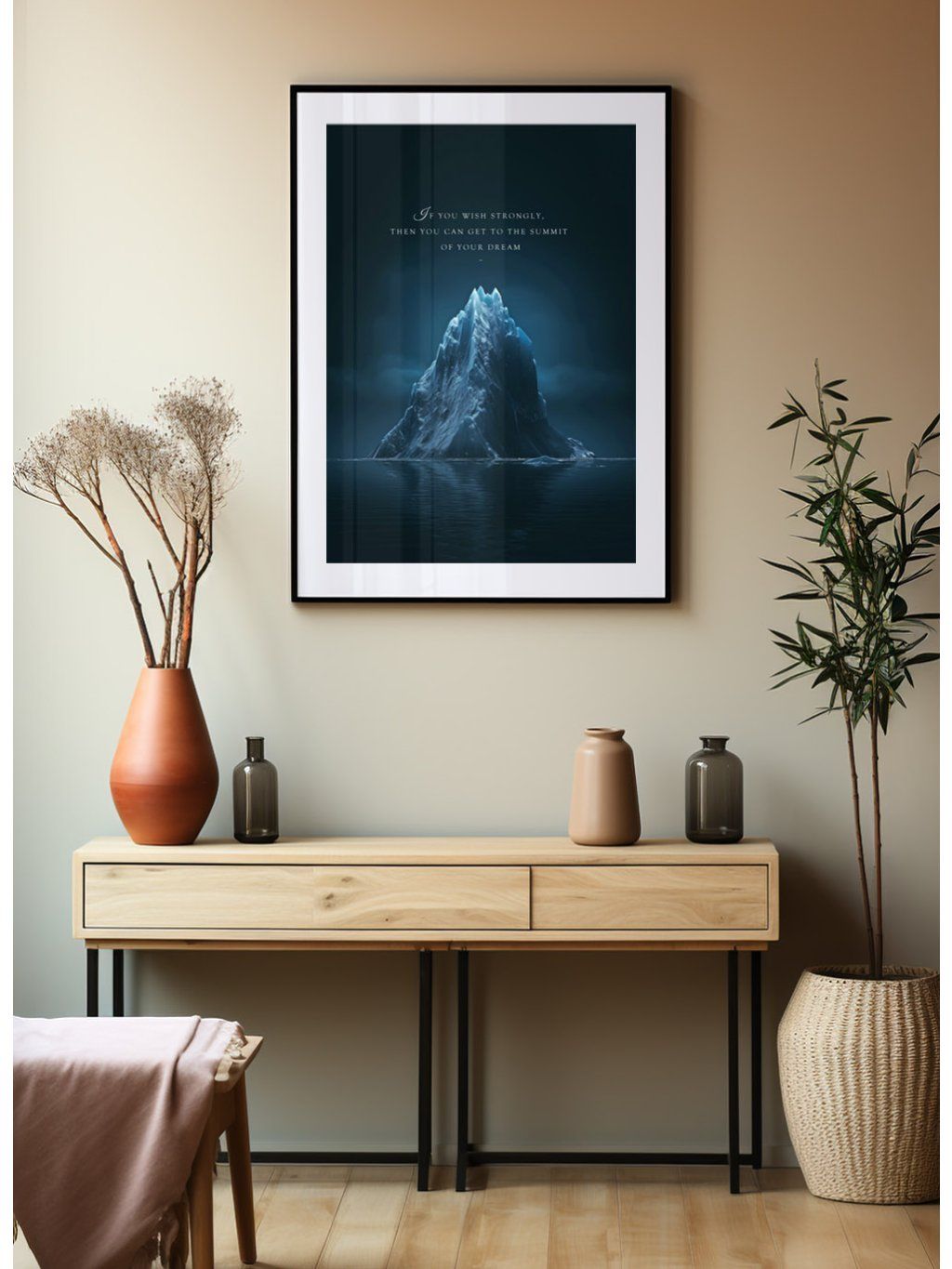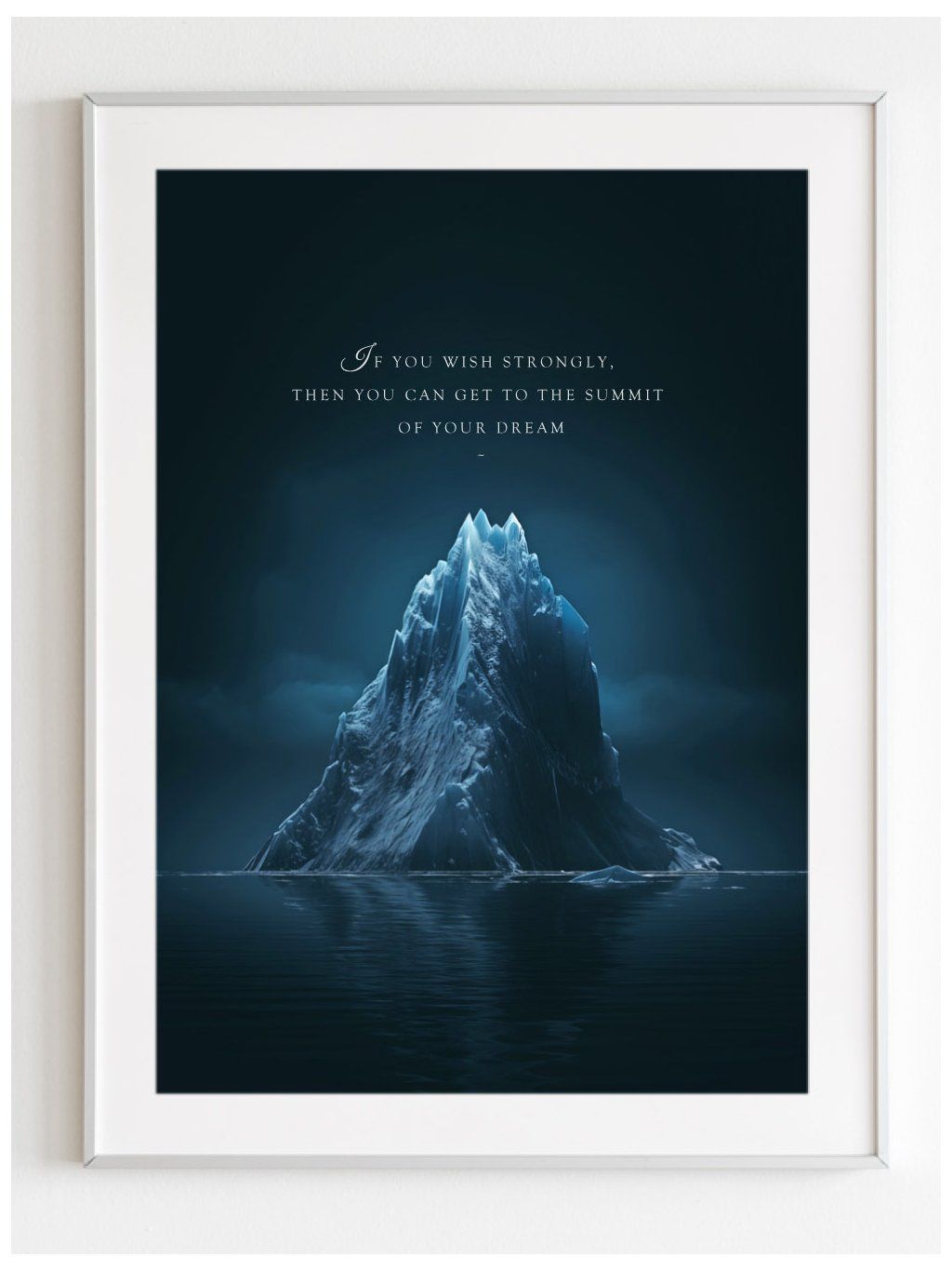 Motivační plakát ledovce citátem "If you wish strongly, then you can get to the summit of your dream." s bílým okrajem.