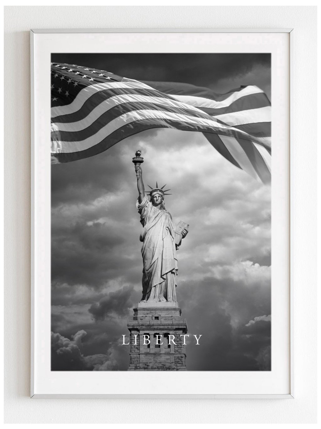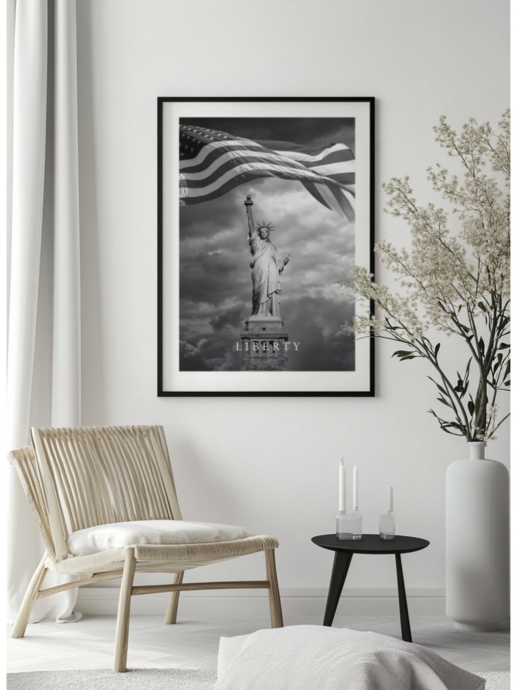 Černobílý plakát "Liberty" socha svobody v New Yorku s vlajkou USA s bílým okrajem.