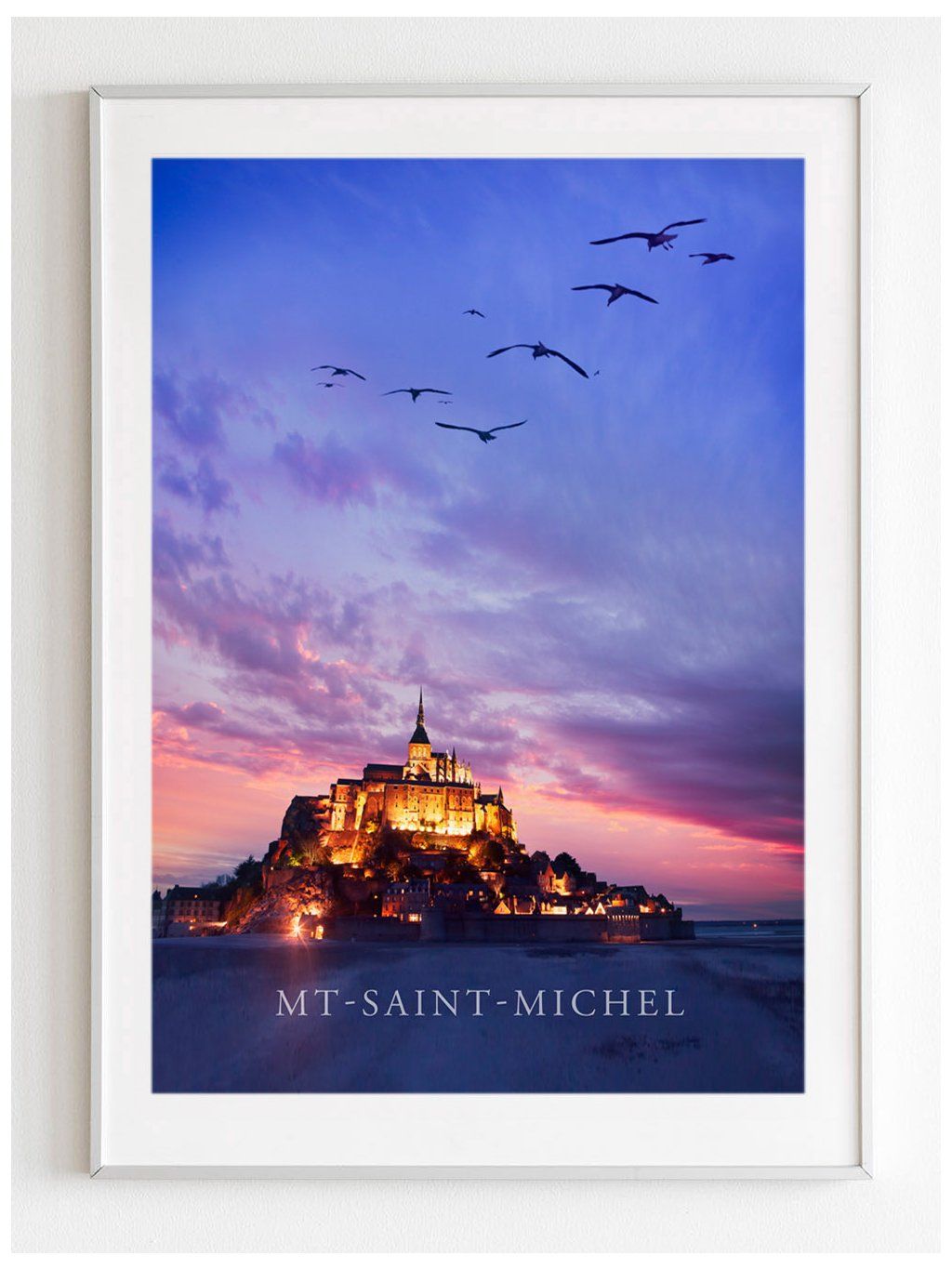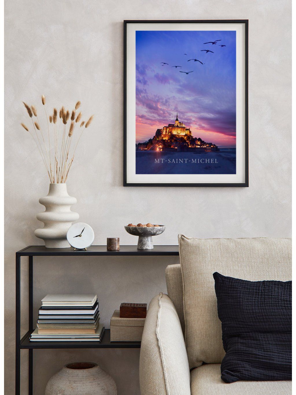 Plakát ikonický kostel na ostrově Mont-Saint-Michel v Normandii při západu slunce.