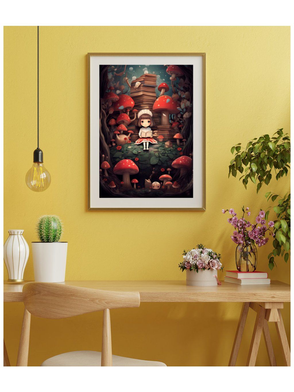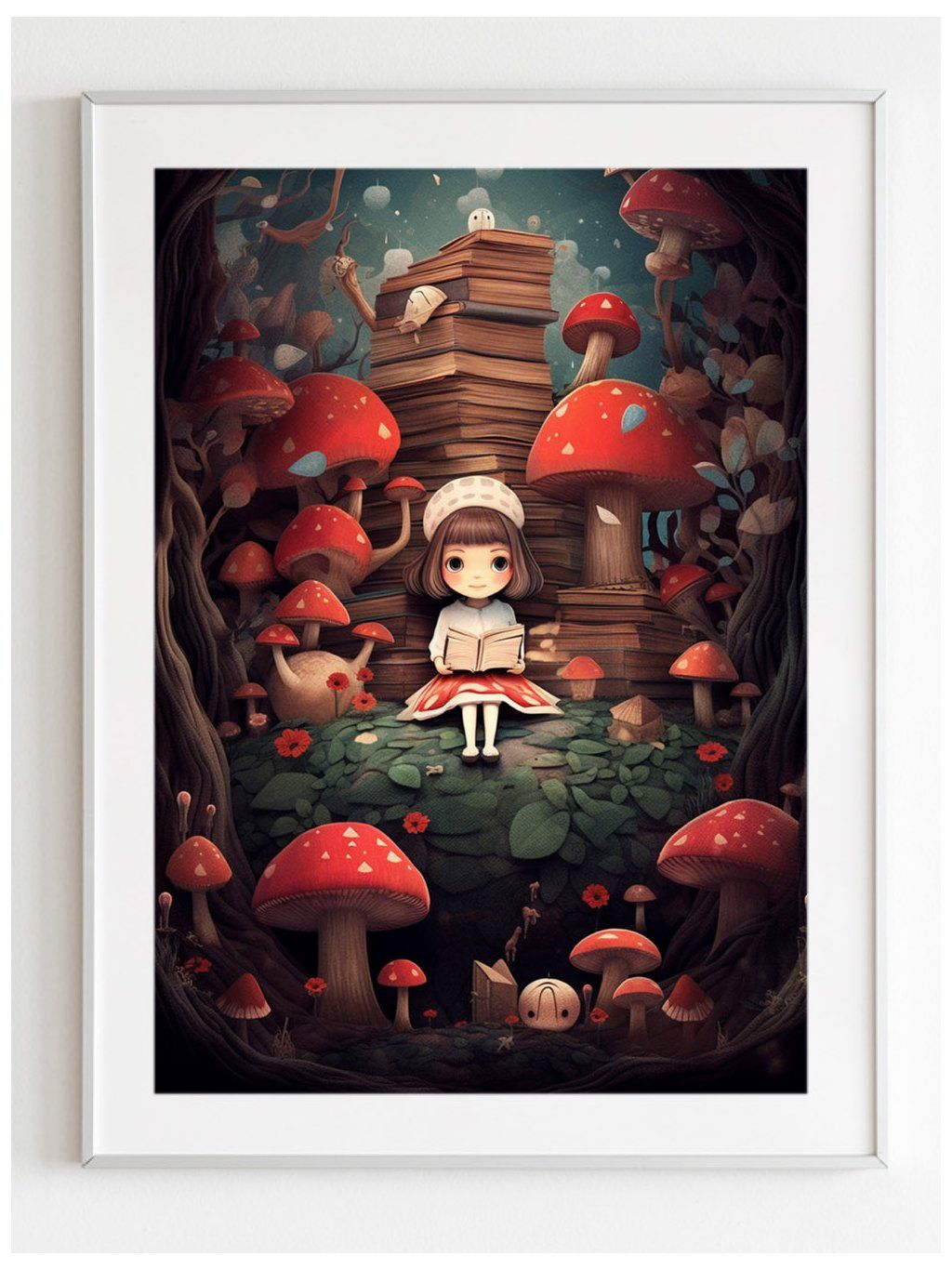 Plakát pro děti Muchomůrková holčička s knížkou, s bílým okrajem.
