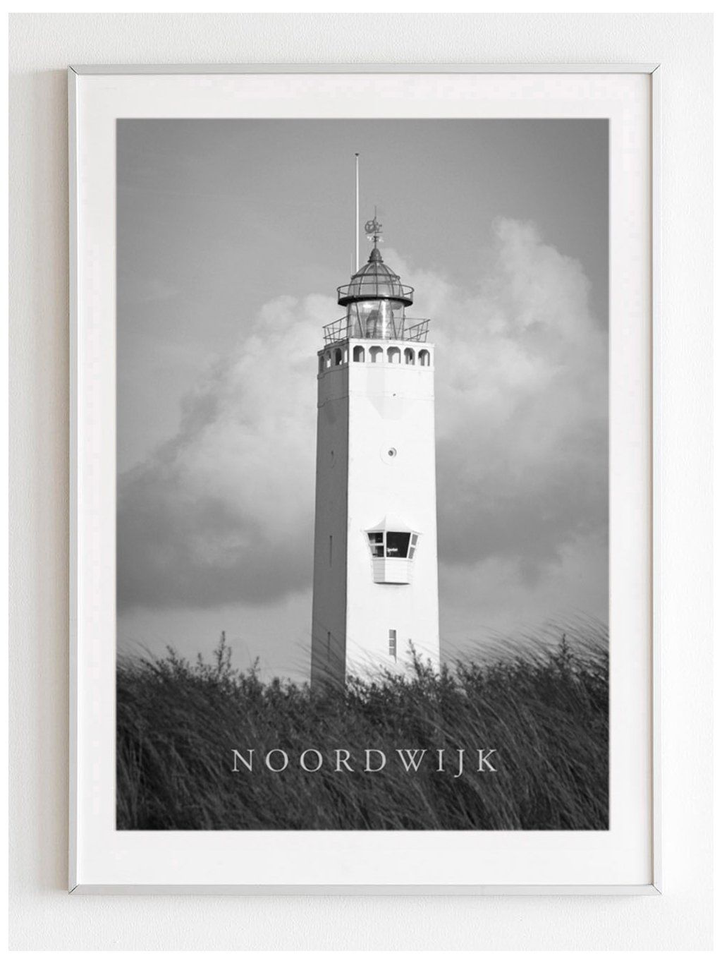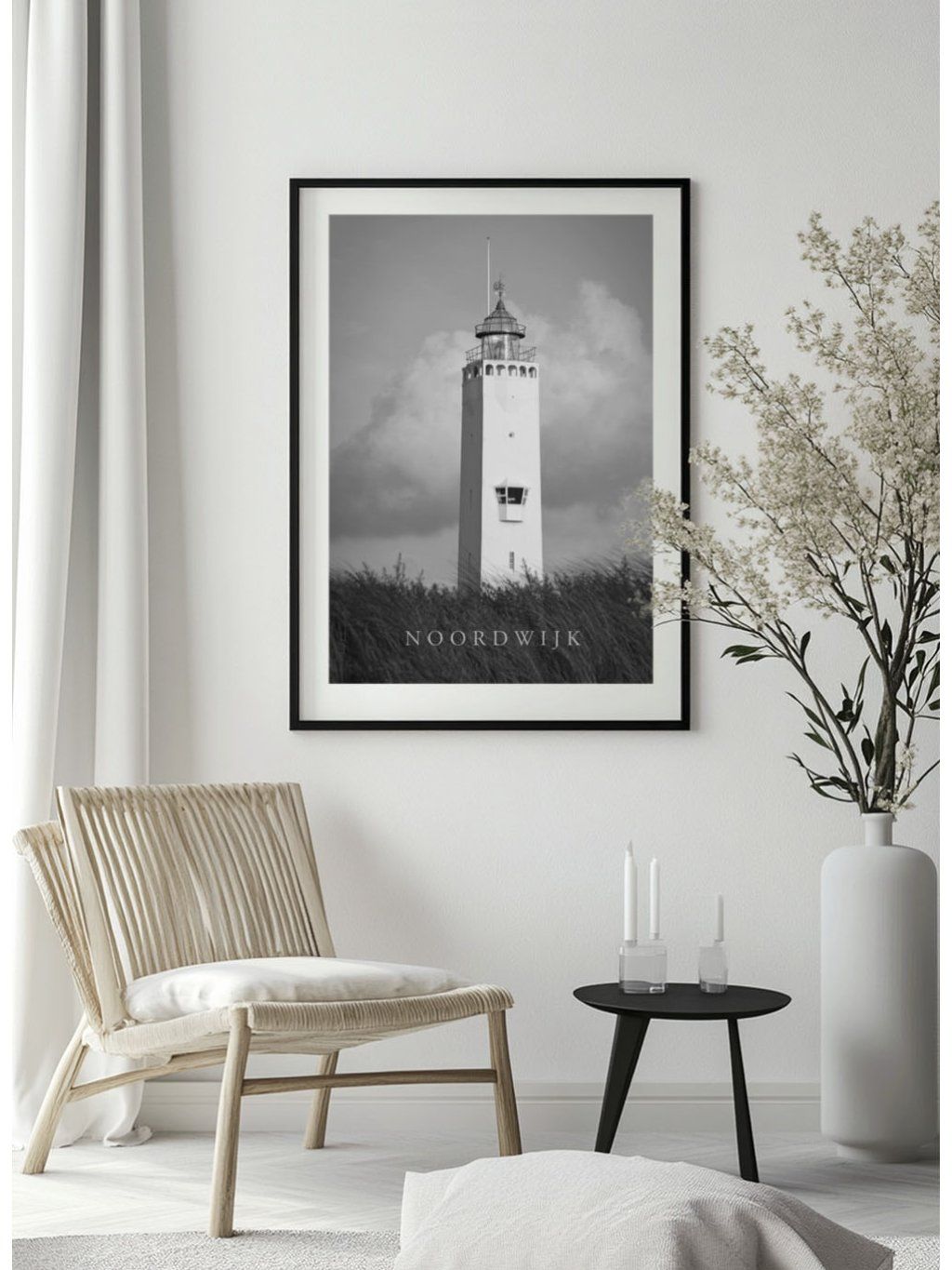 Černobílý plakát "Noordwijk" maják s bílým okrajem.