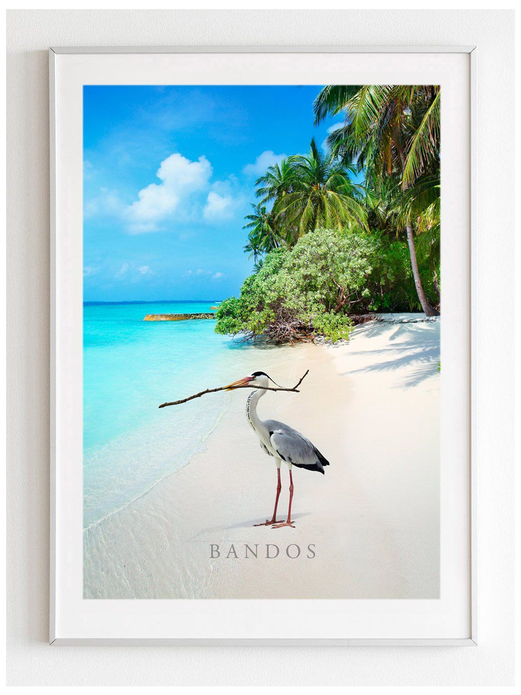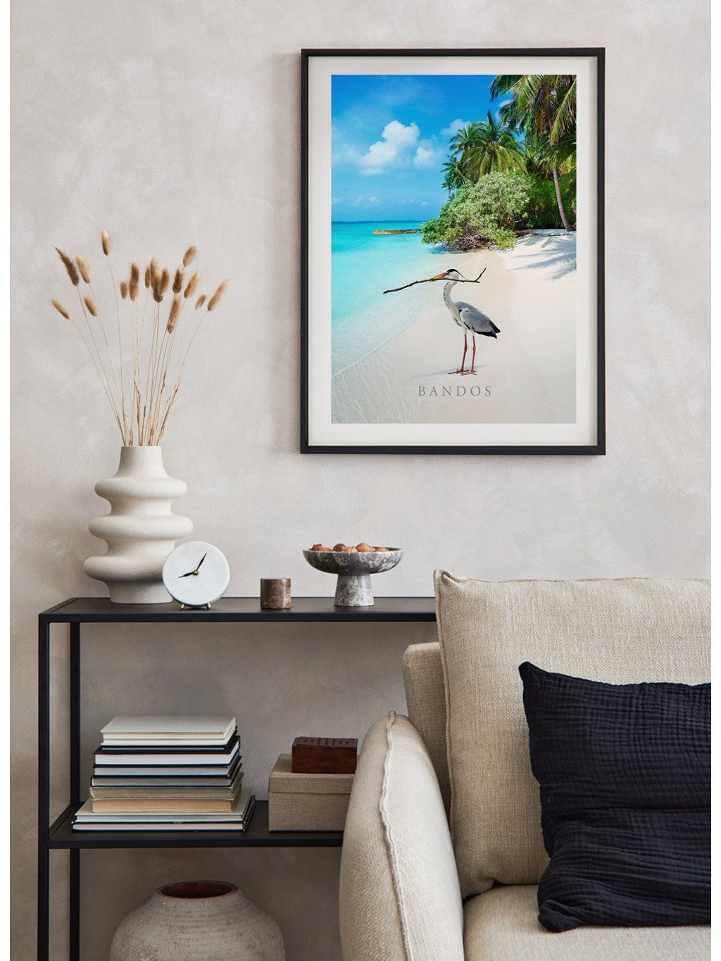 Plakát volavka na nádherné písčité tropické pláži ostrova Bandos ležícího na Maledivách.