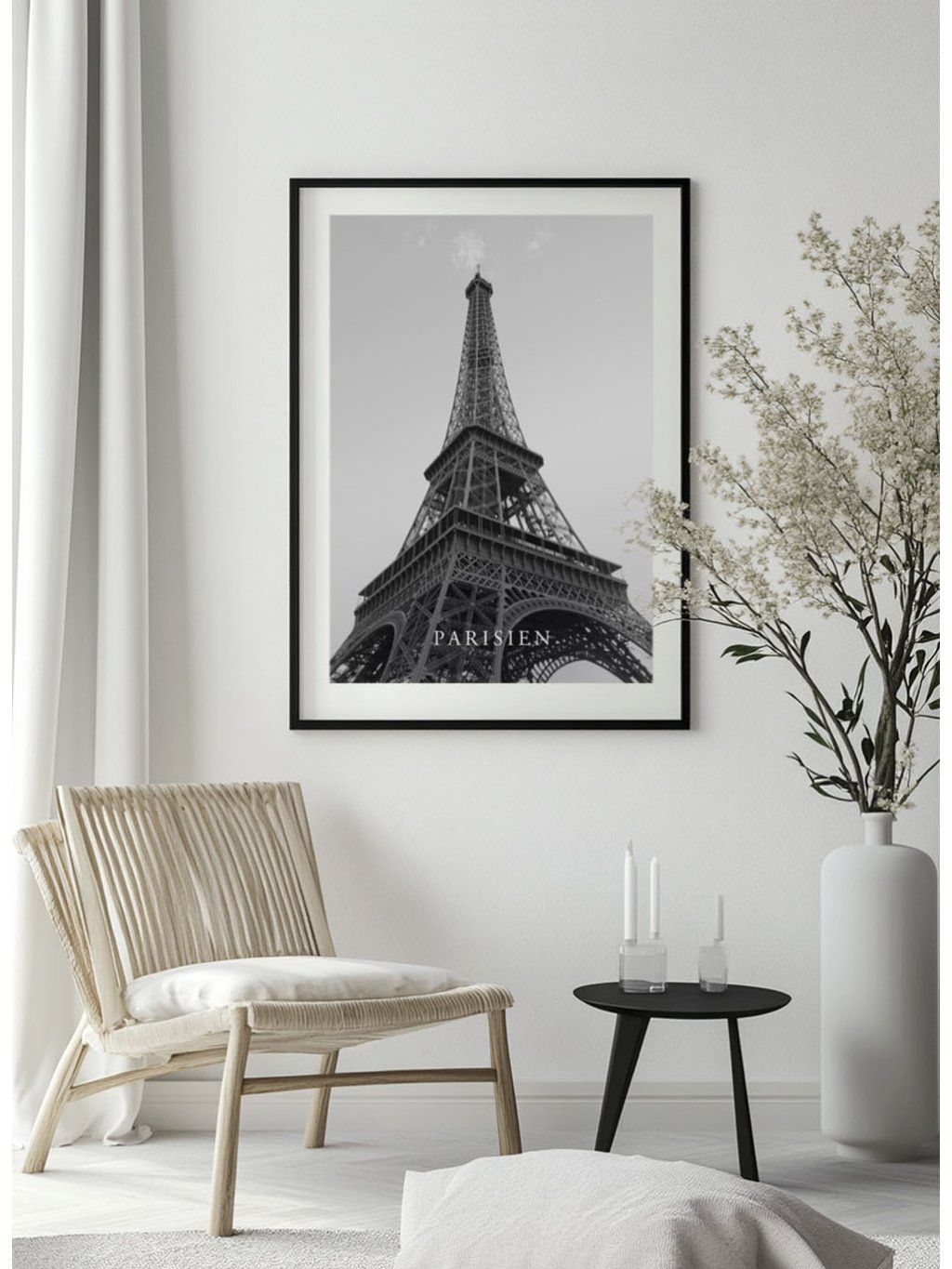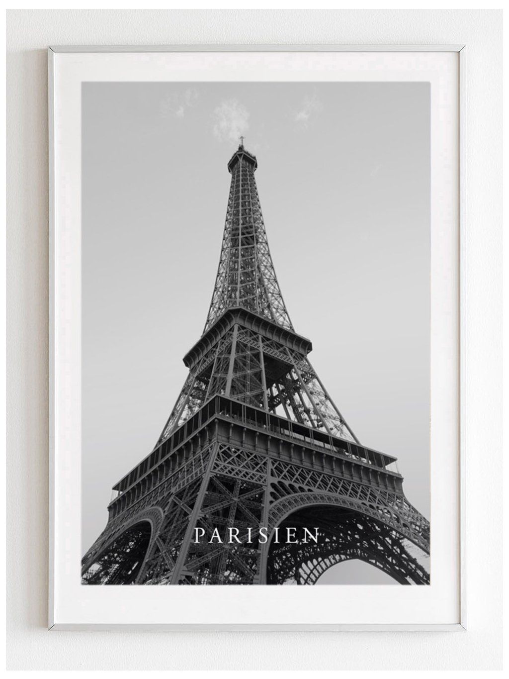 Černobílý plakát "Parisien" Eiffelova věž s bílým okrajem.