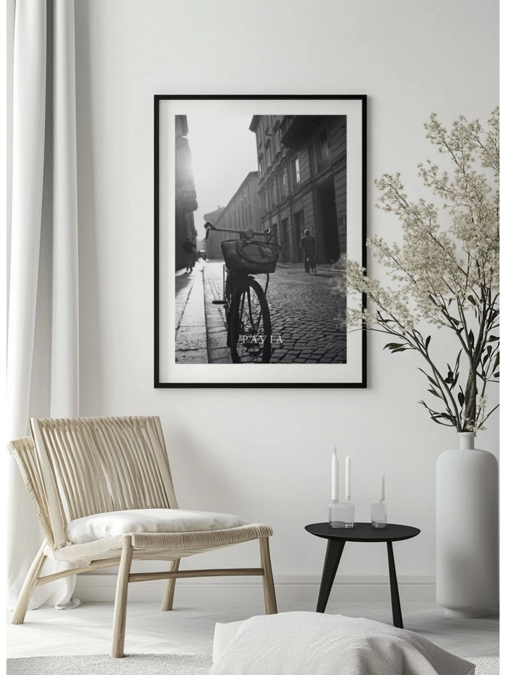 Černobílý plakát "Pavia" tichá ulice s bílým okrajem.