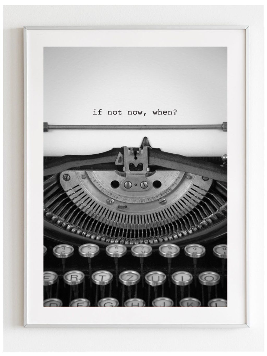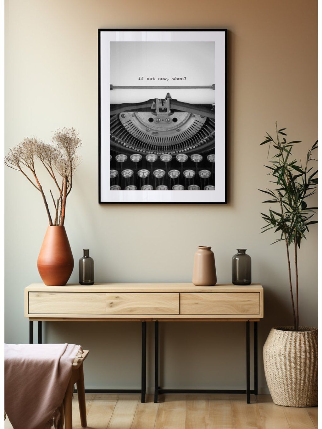 Motivační retro plakát s psacím strojem s citátem "If not now, when?" s bílým okrajem.