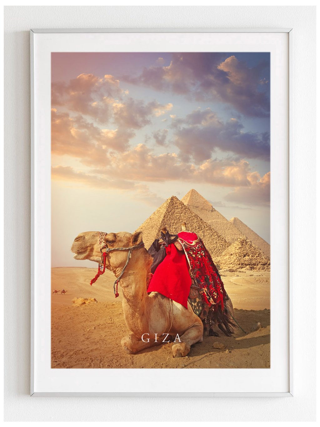 Plakát velbloud při západu slunce s pozadím legendárních pyramid v Gize.