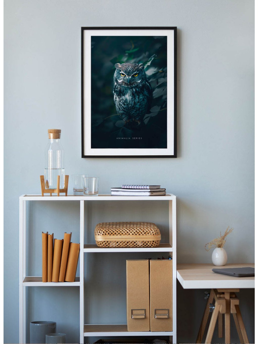 Plakát tajuplná sova v temném lese s bílým okrajem.
