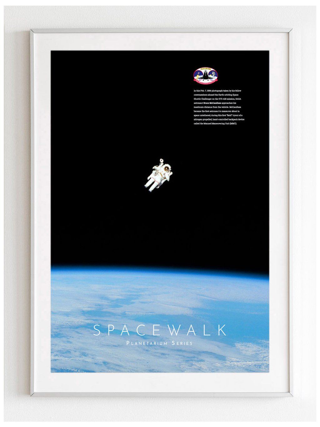 Plakát vesmírná mise Challenger s astronautem ve volném vesmíru s anglickým popiskem, s bílým okrajem.