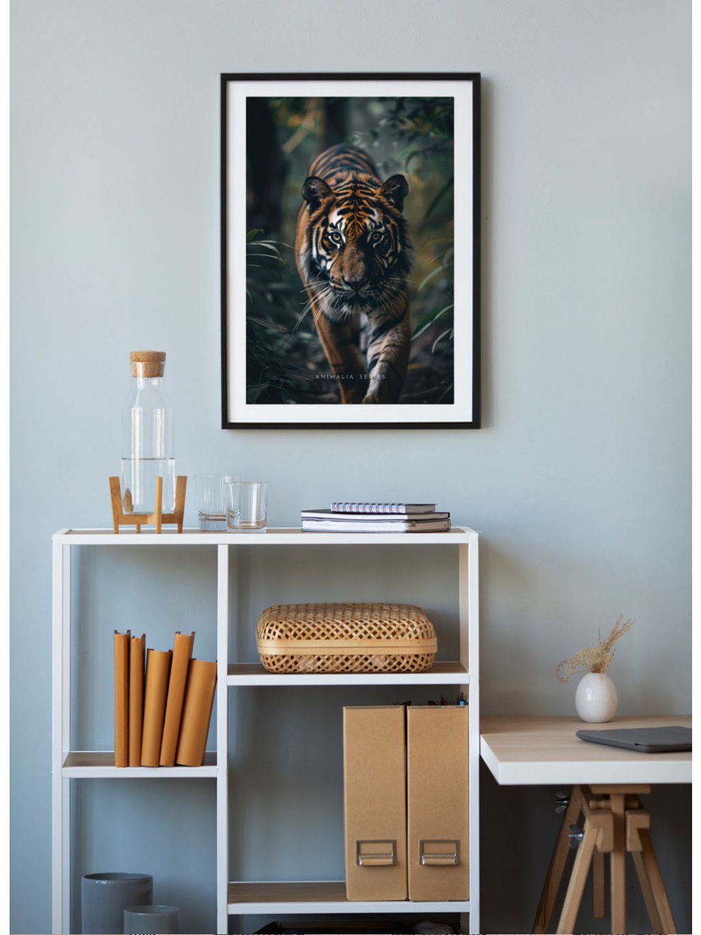 Plakát tigr kráčející v pralese s bílým okrajem.