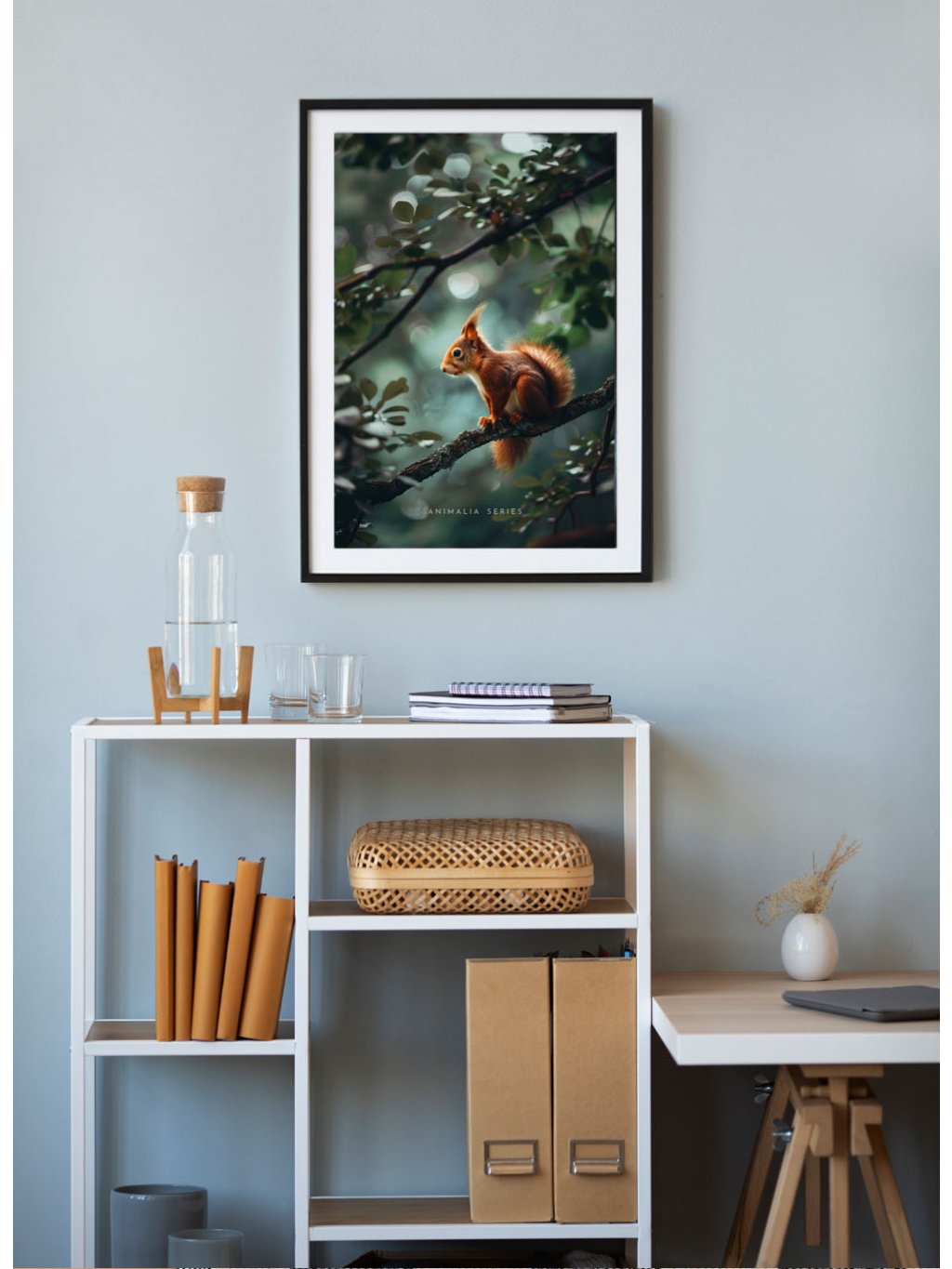 Plakát roztomilá rezavá veverka v lese sedící na větvi s bílým okrajem.