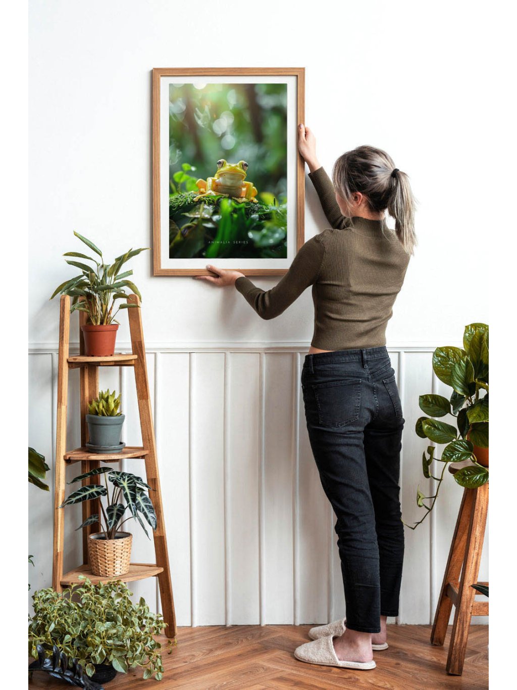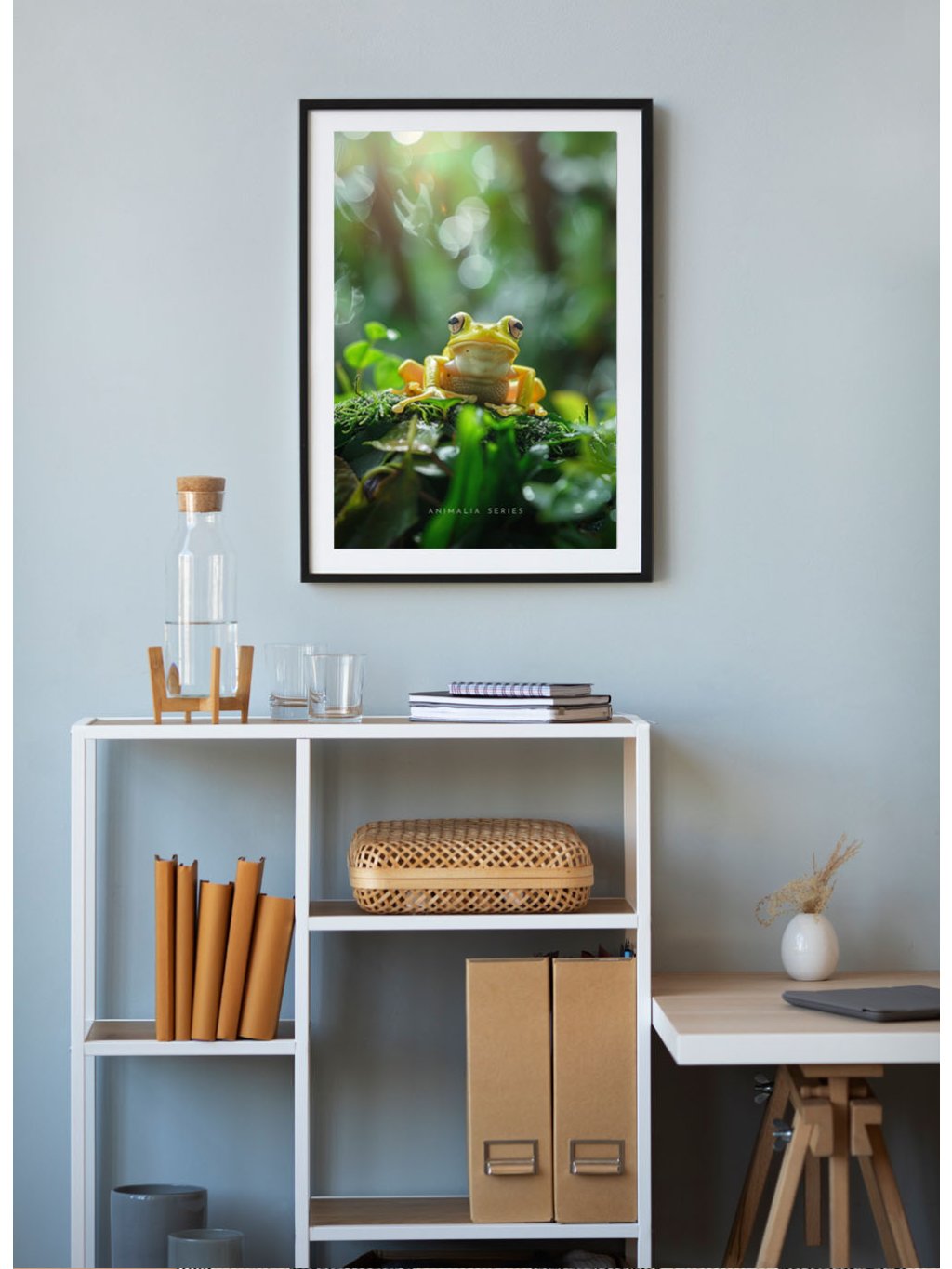 Plakát zelená žabka v pralese s bílým okrajem.