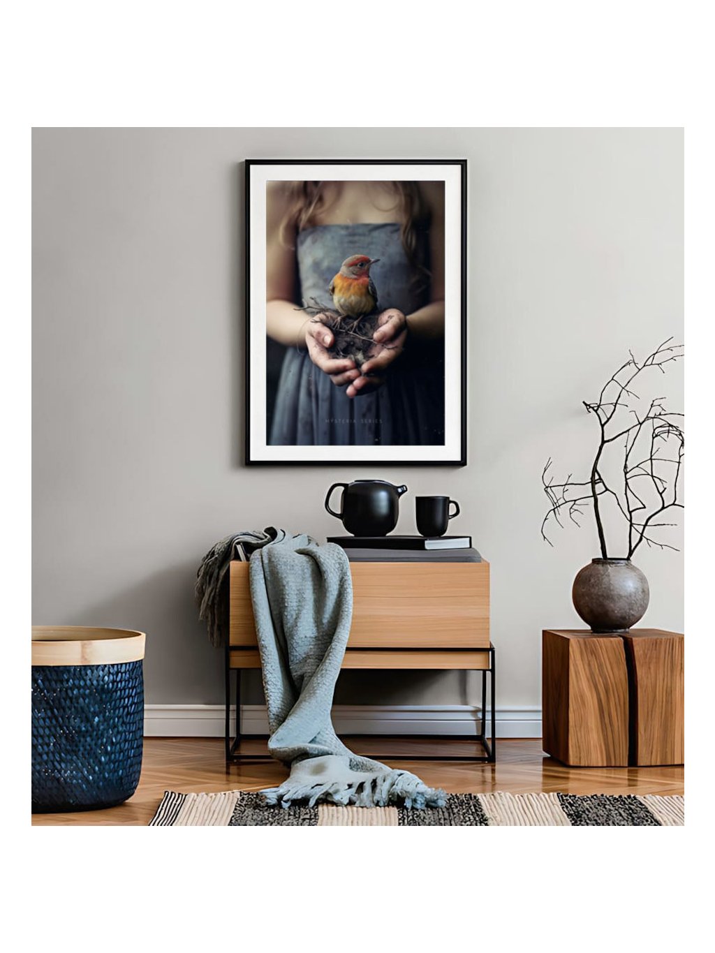 Plakát Ptáček v rukou mladé dívky, s bílým okrajem.