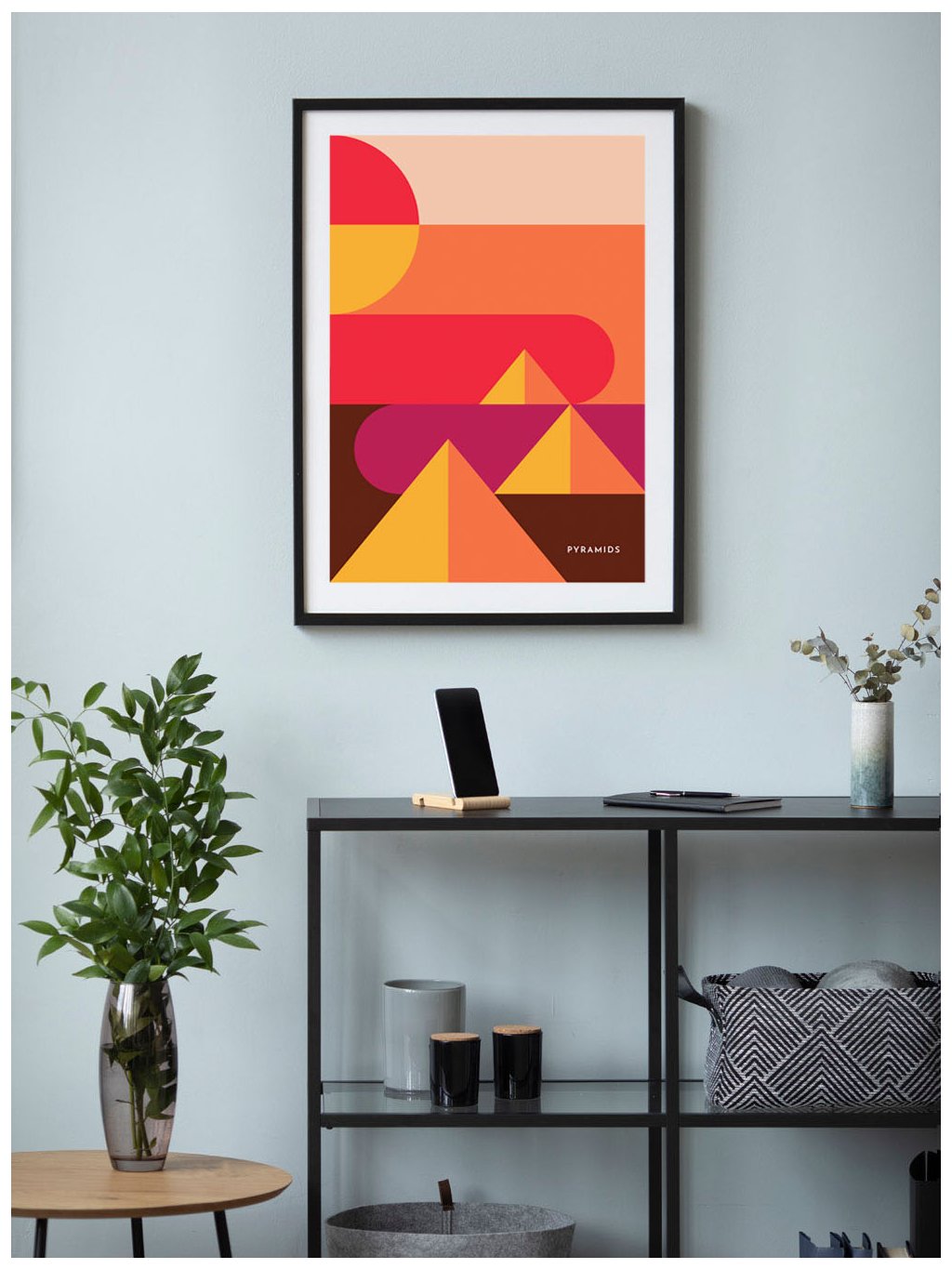 Grafický plakát Pyramids s bílým okrajem s podpisem autora.