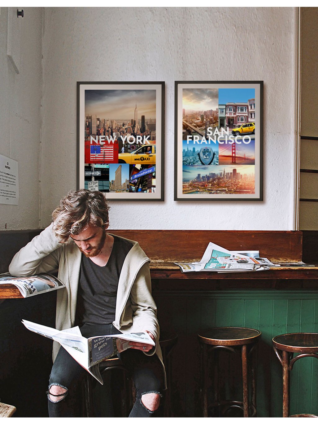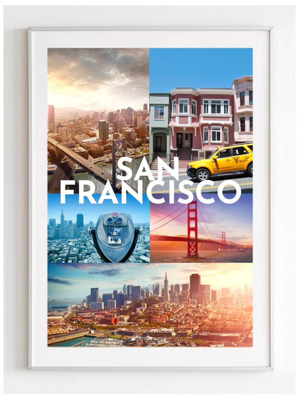 Plakát koláž fotografií města San Francisco ( Golden Gate Bridge, Oakland Bay Bridge) s bílým okrajem.