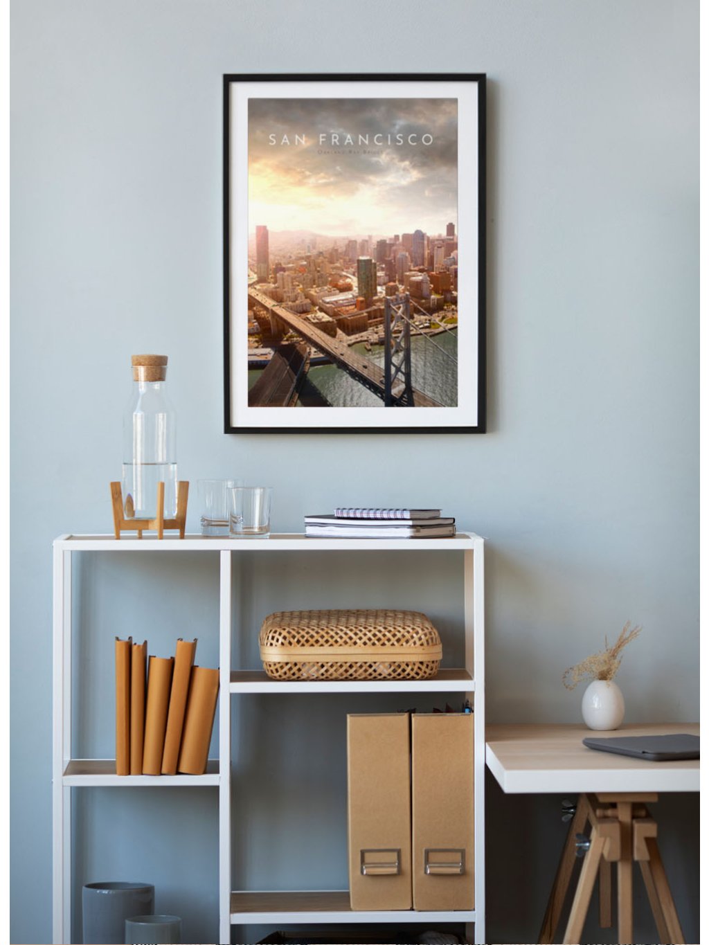 Plakát San Francisco Oakland Bay Bridge s bílým okrajem.