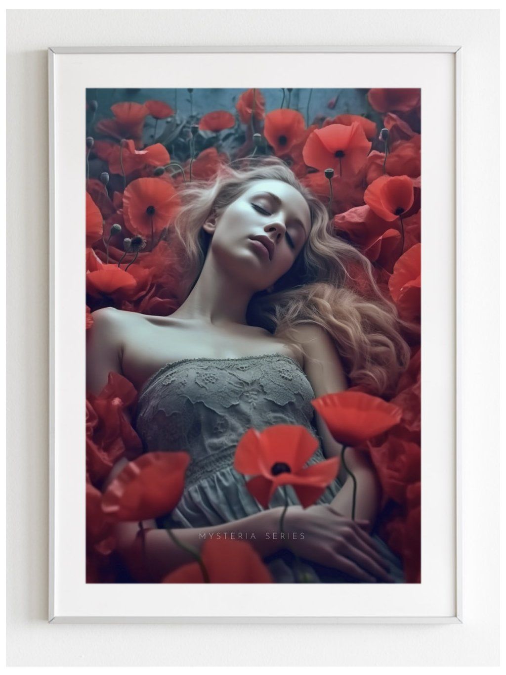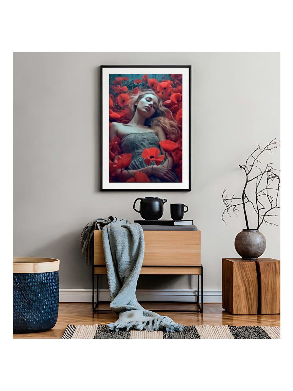 Plakát Spící dívka mezi vlčími máky, s bílým okrajem.