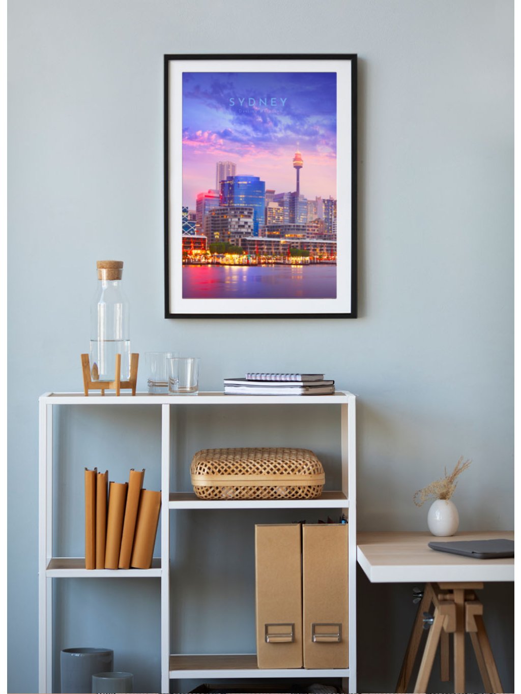 Plakát Sydney Darling Harbour za soumraku s bílým okrajem.